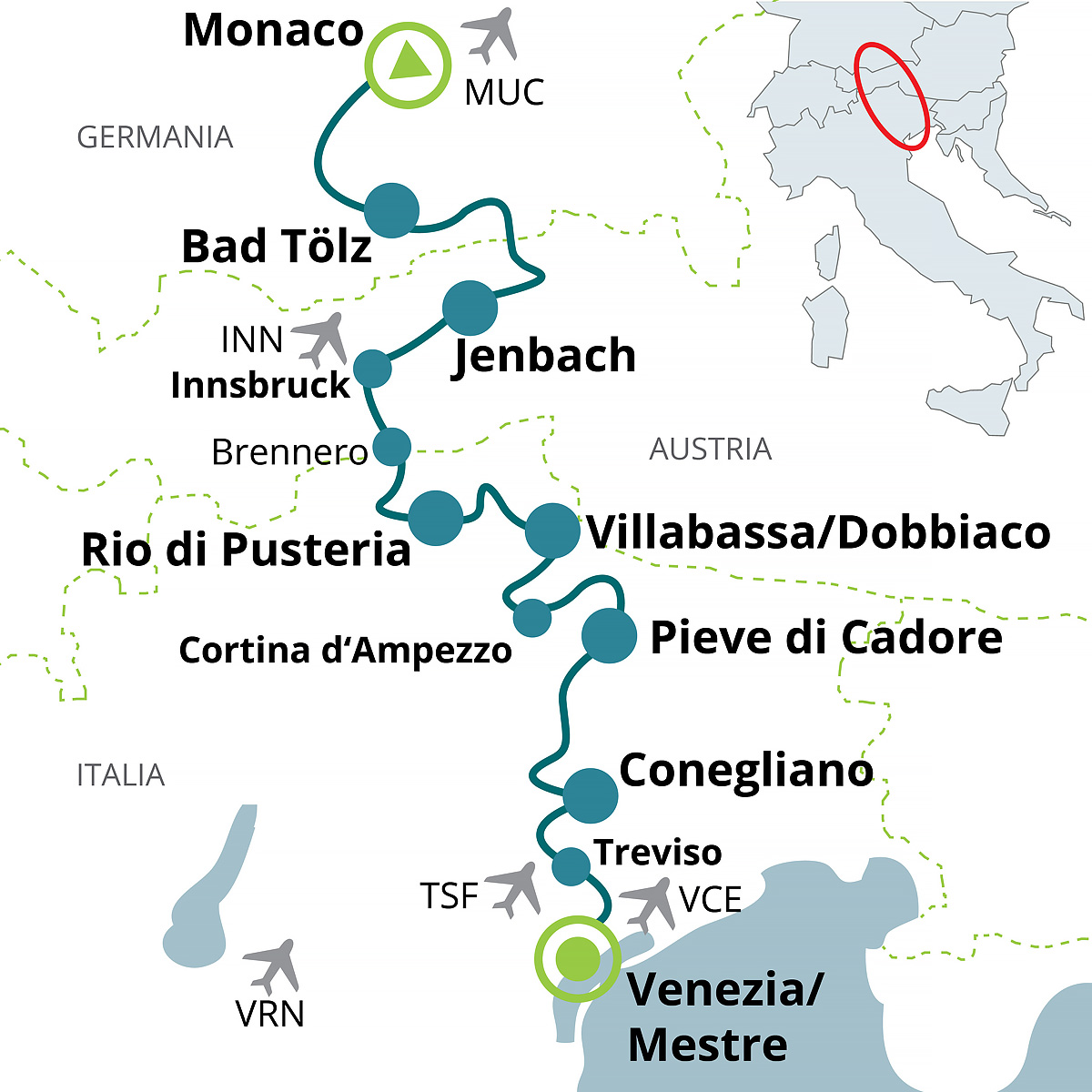 Na cyklocestách, cyklistických trasách a vedľajších cestách objavíte množstvo výnimočných prírodných a kultúrnych krás týchto troch krajín. Cyklotrasa začína v bavorskej metropole Mníchov a končí v lagúnovom meste Benátky. Vedie najskôr popri bavorských jazerách a rieke Inn v tirolskom údolí Inntal, následne pokračuje cez nádherné Dolomity, ktoré sú súčasťou prírodného dedičstva UNESCO, najprv do Trevisa a potom do lagúnového mesta Benátky s kanálmi a historickými budovami. Jedinečné striedanie veľkých miest a malých romantických dediniek, jazier, údolí, hradov a pevností... túto trasu si nemožno nezamilovať!