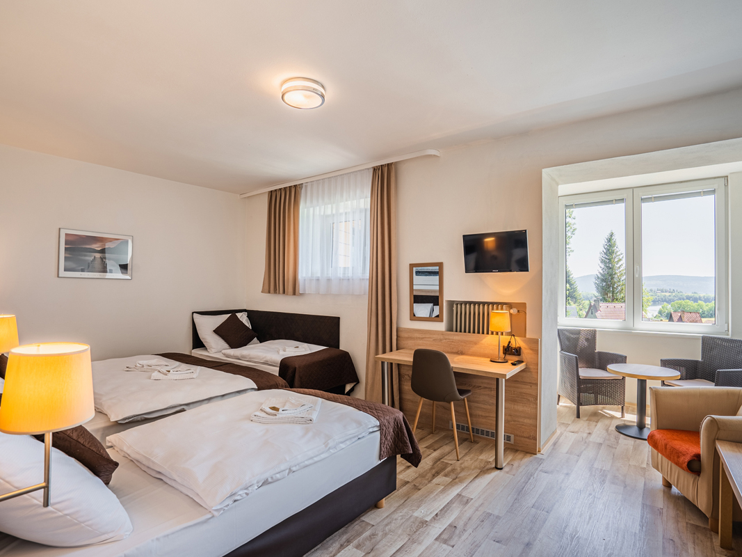 18 m² - izba s manželskou posteľou alebo 2 samostatnými lôžkami, s možnosťou prístelky formou rozkladacej pohovky až pre 2 deti do nedovŕšených 12 rokov, sociálne zariadenie