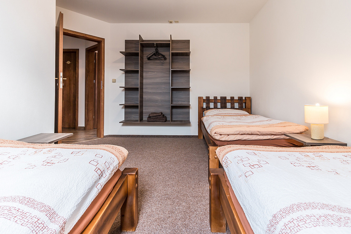apartmán s 2 oddelenými spálňami, jedna spálňa s manželskou posteľou či 2 samostatnými lôžkami, druhá spálňa s 3 samostatnými lôžkami, obývacia miestnosť s kuchynským kútom, sociálne zariadenie