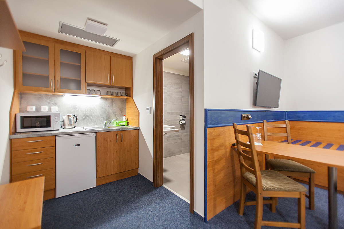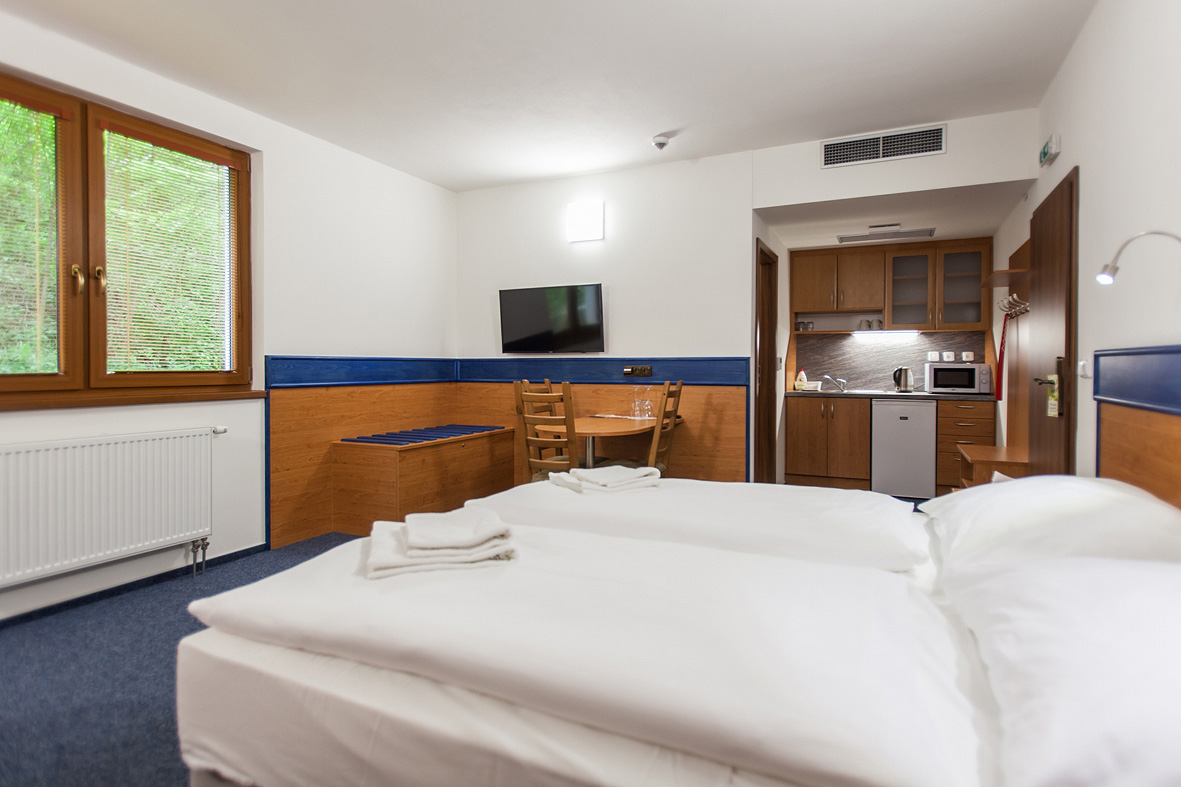 TV, tel., wi-fi pripojenie k internetu, fén, minibar, v izbe Suite 2+2 Kaskáda naviac v kuchynke rýchlovarná kanvica, mikrovlnná trúba, chladnička, zakladné kuchynské vybavenie