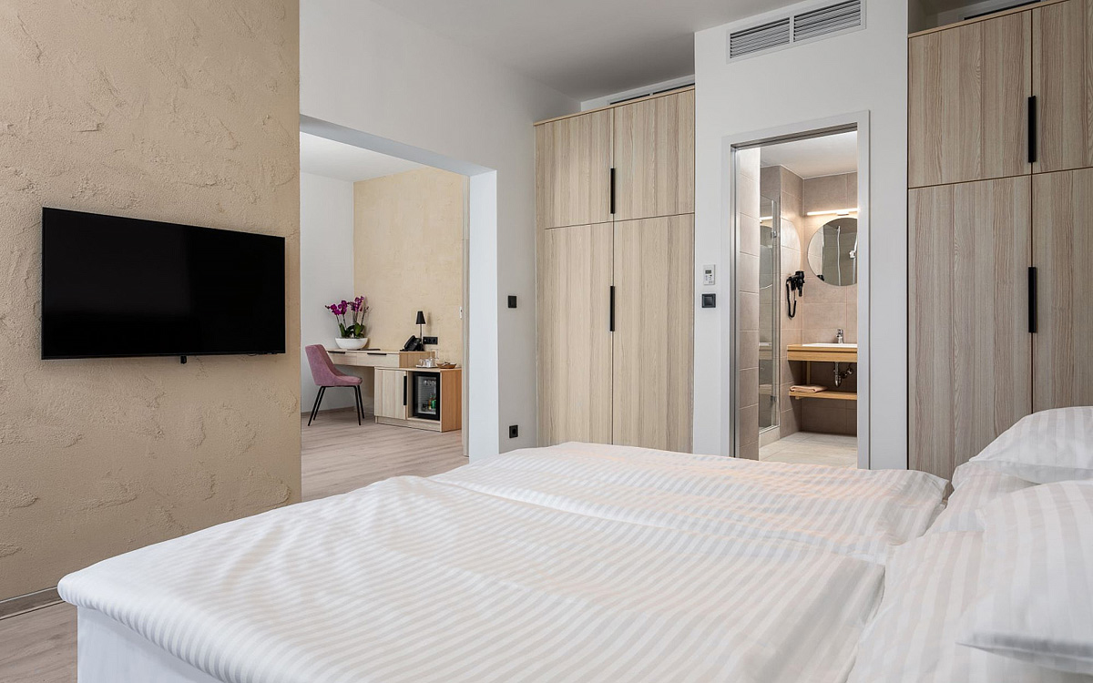 Na vyžiadanie aj veľké rodinné izby či bezbariérová izba. Podľa dispozícií budovy, hotel disponuje zhruba polovicou izieb s balkónom, ktoré nemožno garantovať.