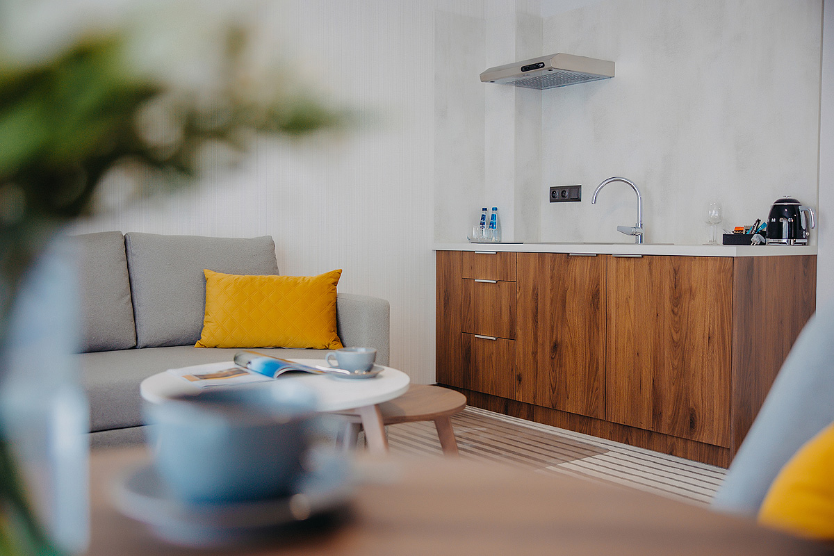 40 m² - nachádza sa v apartmánovej časti, spálňa s manželskou posteľou, či 2 samostatnými lôžkami, obývacia izba s malým kuchynským kútom a stolíkom, rozkladacím gaučom pre 2 osoby, sociálne zariadenie, balkón