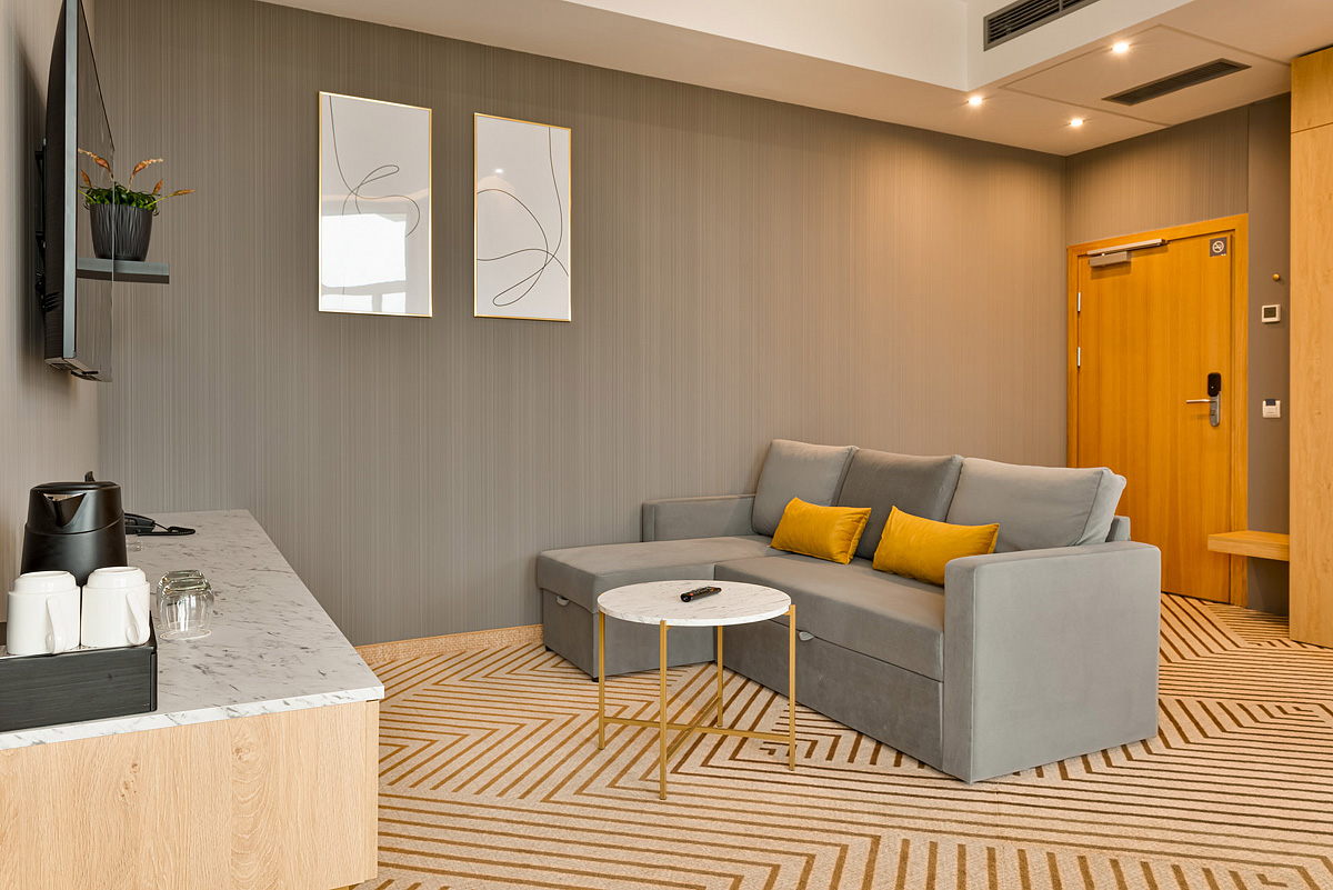 Superior 2+2 - 45-až 48m² – spálňa s manželskou posteľou 180x200 cm či s oddeliteľnými lôžkami, priestranná obývacia izba s rozkladacím gaučom až pre 2 deti do nedovŕšených 10 rokov (šířka 120 cm), sociálne zariadenie, balkón s panoramatickým výhľadom na hory