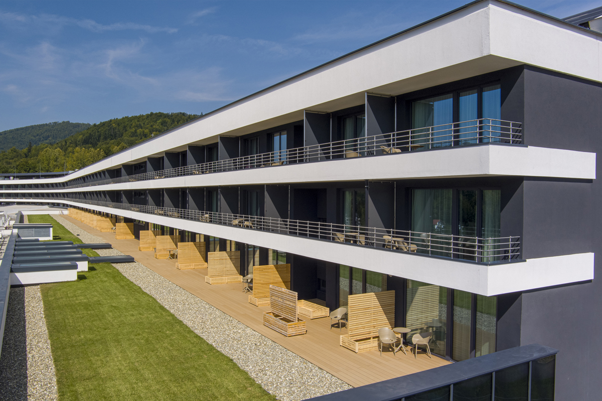 nový, ekologicky navrhnutý hotelový komplex v poľských Beskydách s krásnym výhľadom na panorámu horského masívu