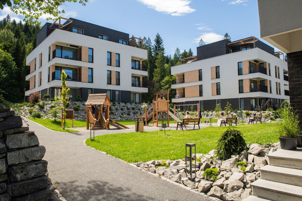 úplne nový rezort pozostávajúci z 9 samostatných budov so 125 komfortnými apartmánmi vysokého štandardu, rekreačný areál v srdci Chránenej krajinnej oblasti Sliezske Beskydy