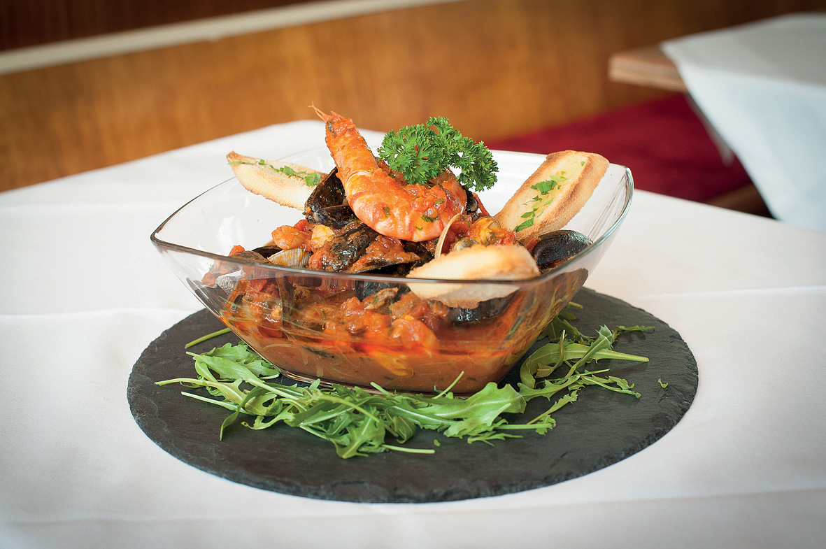 servírované 3chodové menu, spravidla s výberom hlavného jedla s prílohou, a výberom z predjedál, či výber zo 6 druhov pizzy, nápoje za poplatok