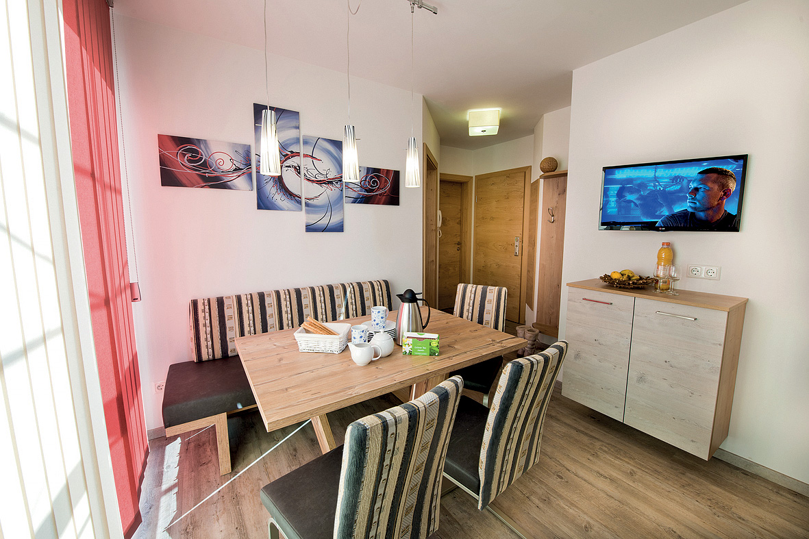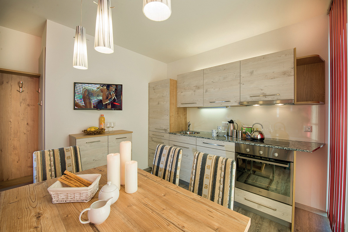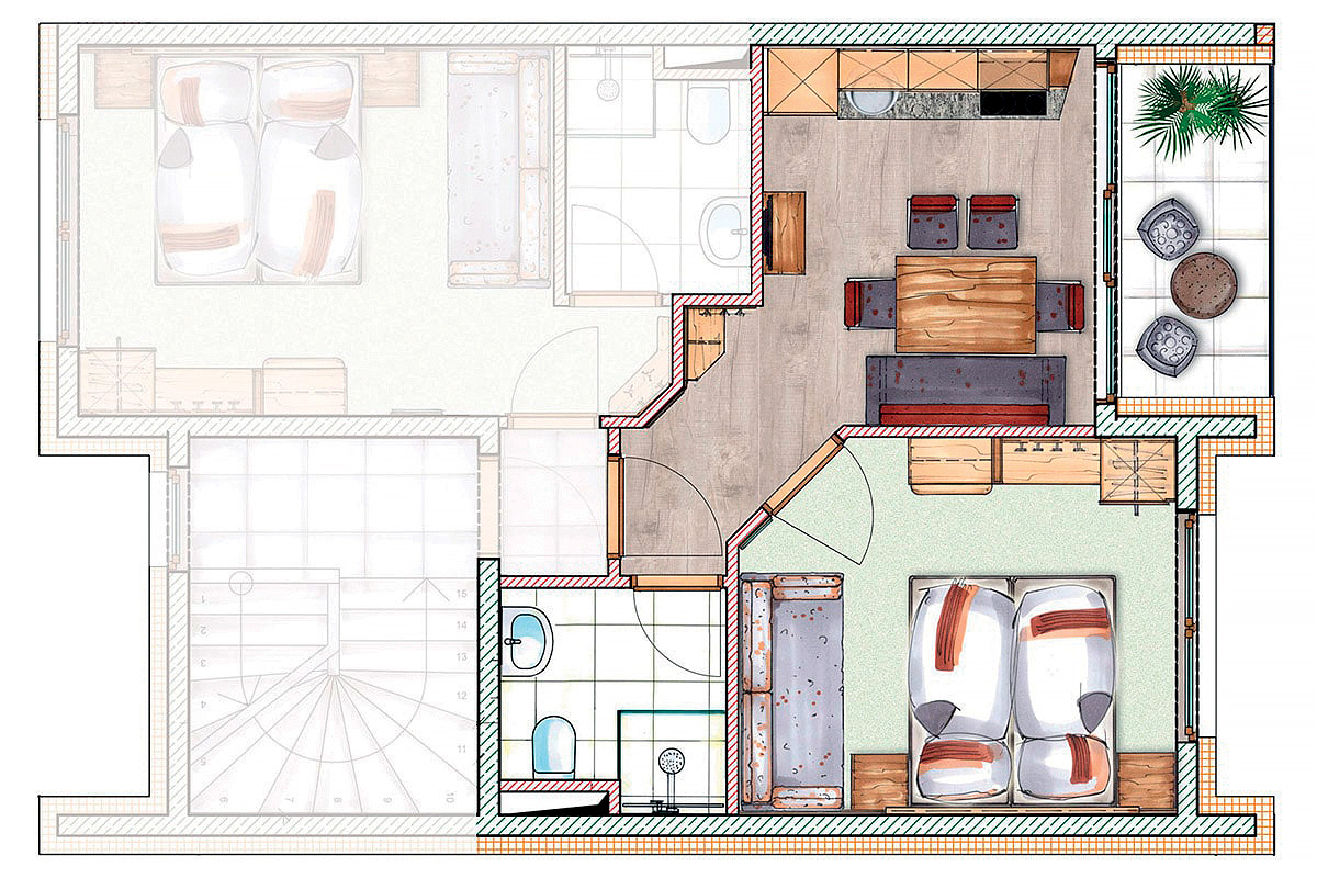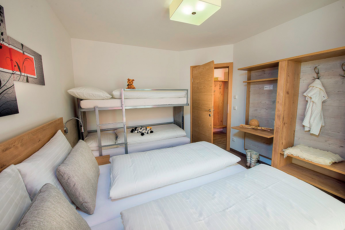 80 m² - 1 spálňa s manželskou posteľou, 1 spálňa s manželskou posteľou a poschodovou posteľou, obývacia izba s rozkladacím gaučom až pre 4 osoby, kuchynským kútom, 2x sociálne zariadenie, oddelené WC, balkón či terasa; apartmán má spravidla 2 podlažia a minimálna obsadenosť apartmánu sú 4 osoby