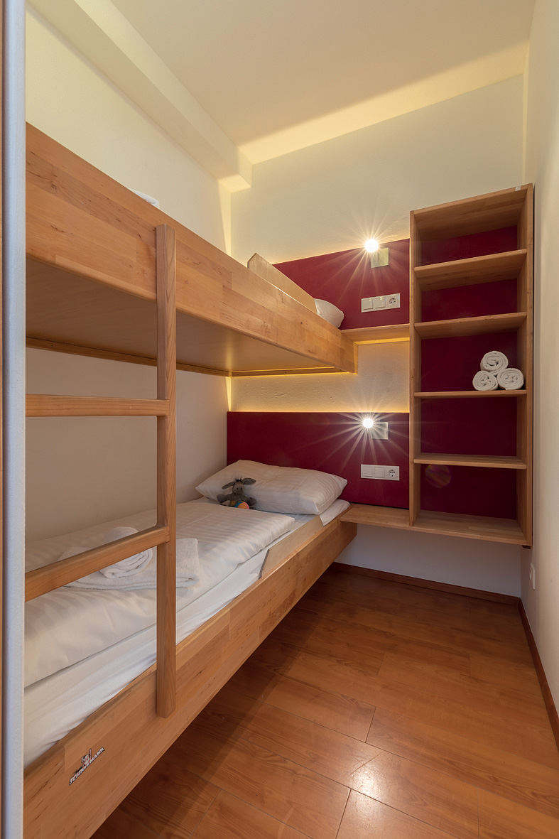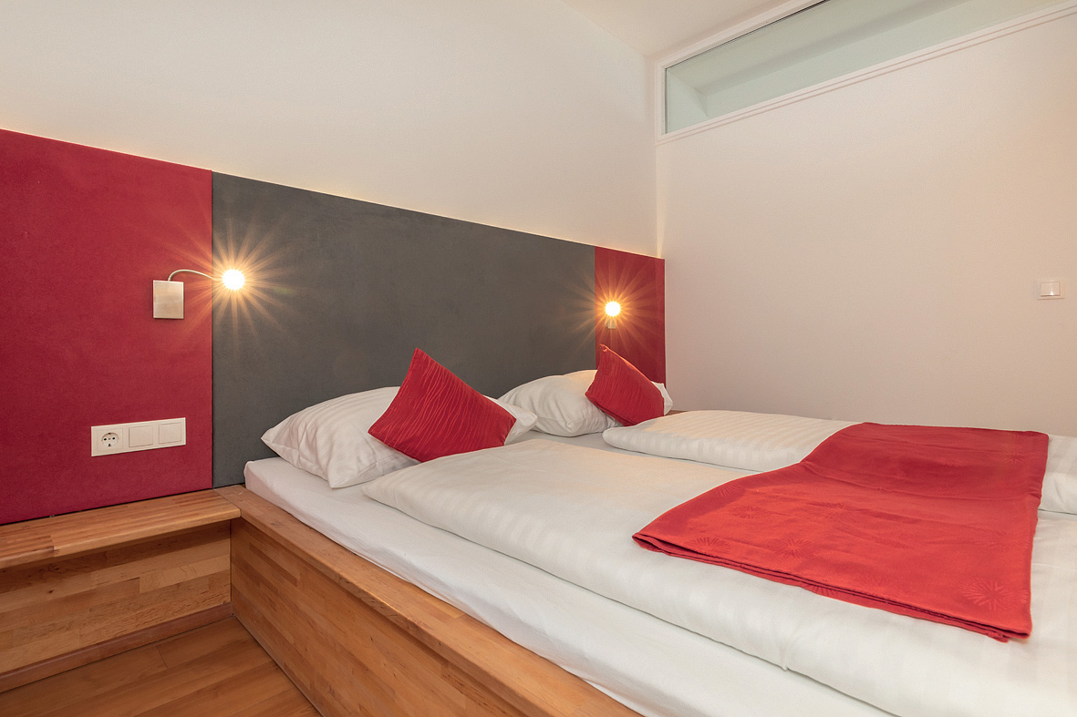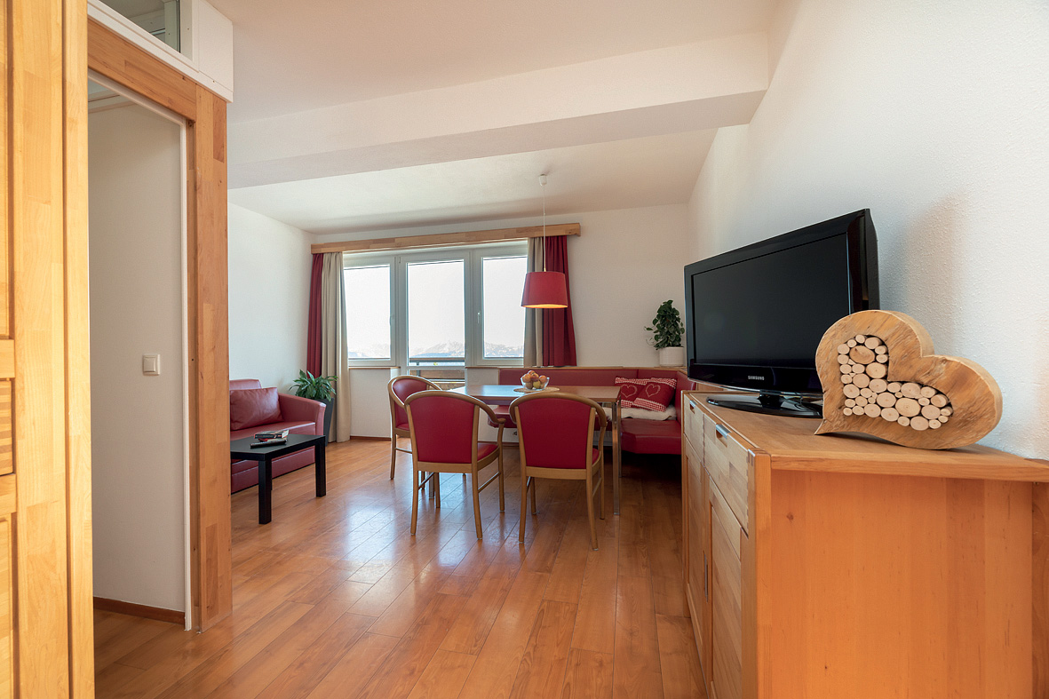 45 m² - 1 kabína s manželskou posteľou, obývacia izba s kuchynským kútom a rozkladacím gaučom pre 2 osoby, sociálne zariadenie s vaňou, oddelené WC, balkón v rámci spoločnej terasy s apartmánom mono 4