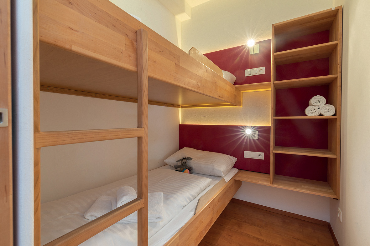 65 m² - 1 spálňa s manželskou posteľou, 1 kabína s manželskou posteľou, 1 kabína s poschodovou posteľou, obývacia izba s kuchynským kútom a rozkladacím gaučom pre 2 osoby, 2x sociálne zariadenie (1x so sprchou, 1x s vaňou; jedno sociálne zariadenie bez WC), 2x balkón