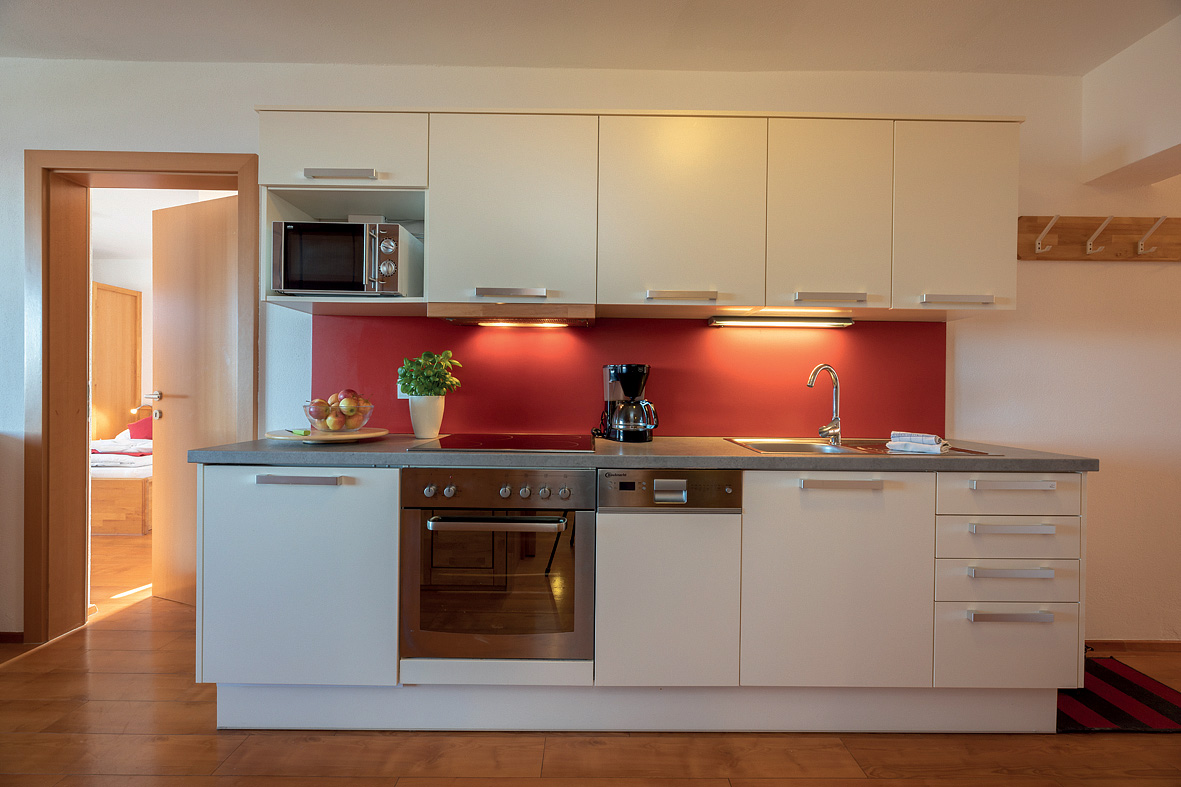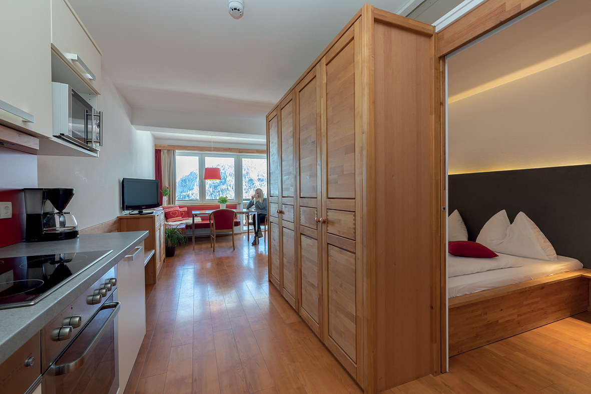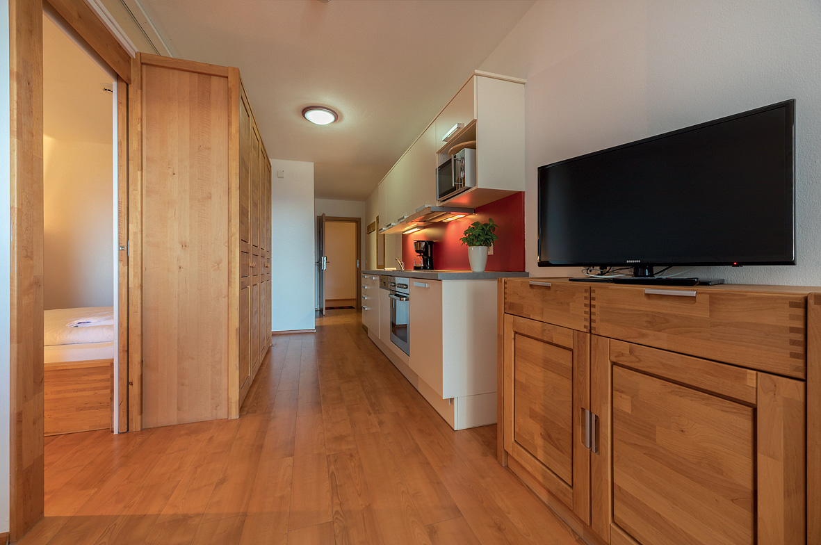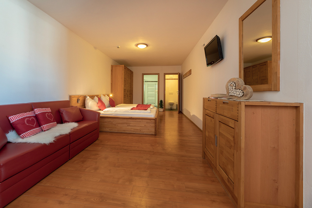 45 m² - obývacia izba s manželskou posteľou a rozkladacím gaučom pre 2 osoby, opticky oddelená predsieň s kuchynským kútom, sociálne zariadenie so sprchou či vaňou, oddelené WC, balkón v rámci spoločnej terasy s apartmánom bilo 4
