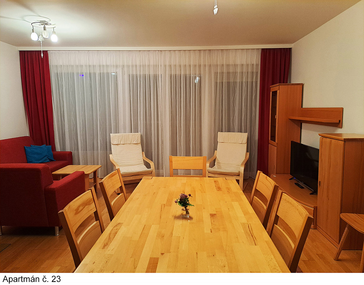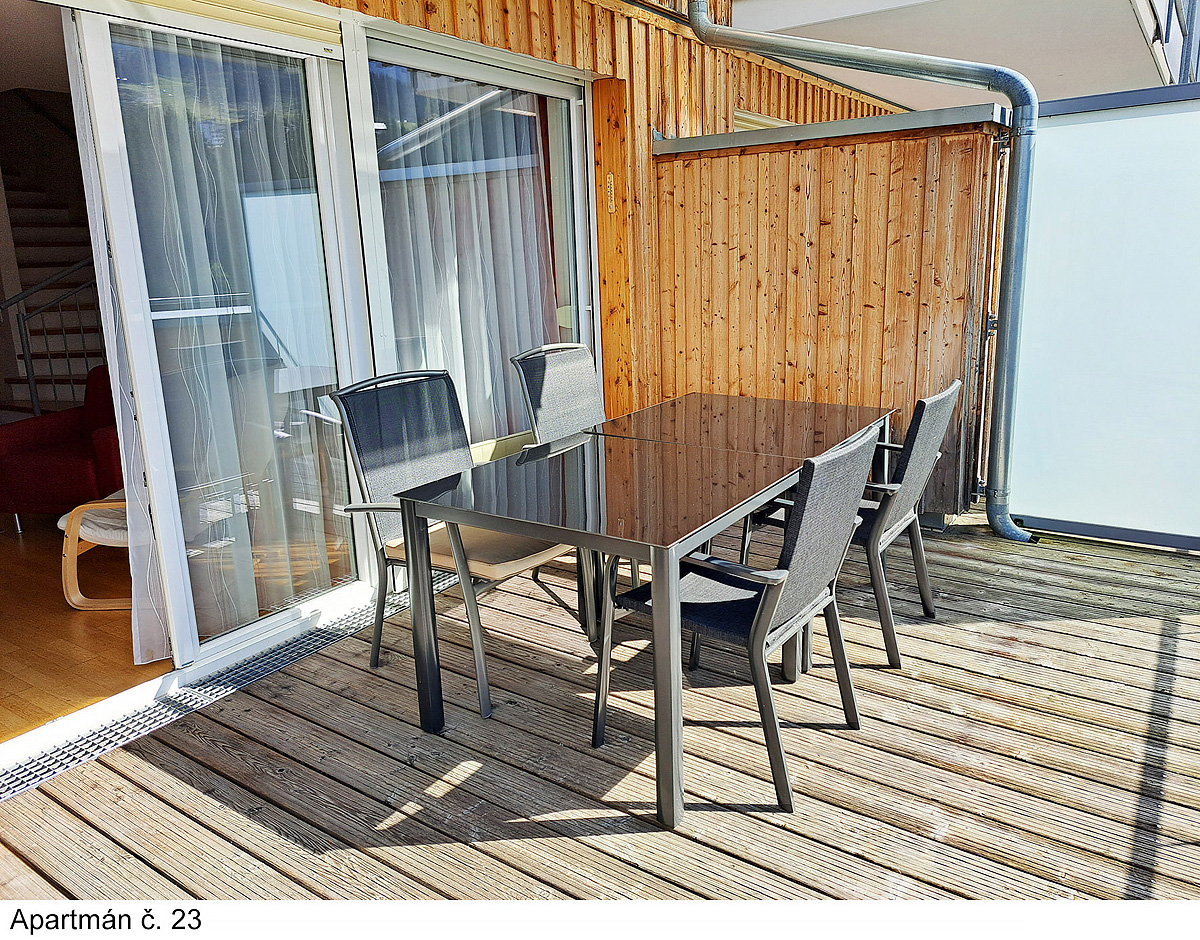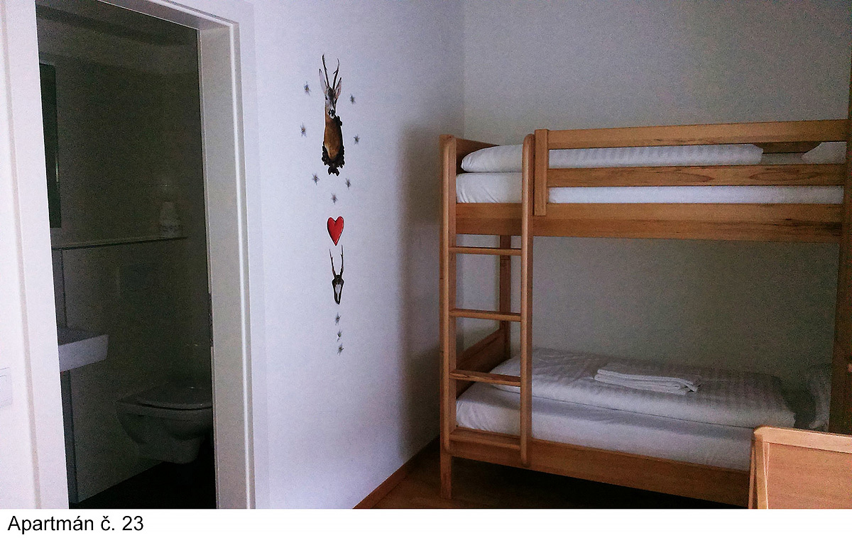 95 m² - 1 podlažie apartmánu: obývacia izba s kuchynským kútom a rozkladacím gaučom pre 2 osoby, sociálne zariadenie, terasa; 2. podlažie apartmánu: 2 spálne s manželskou posteľou, spálňa s 2 poschodovými posteľami, 3x sociálne zariadenie (vždy prístupné zo spálne), balkón