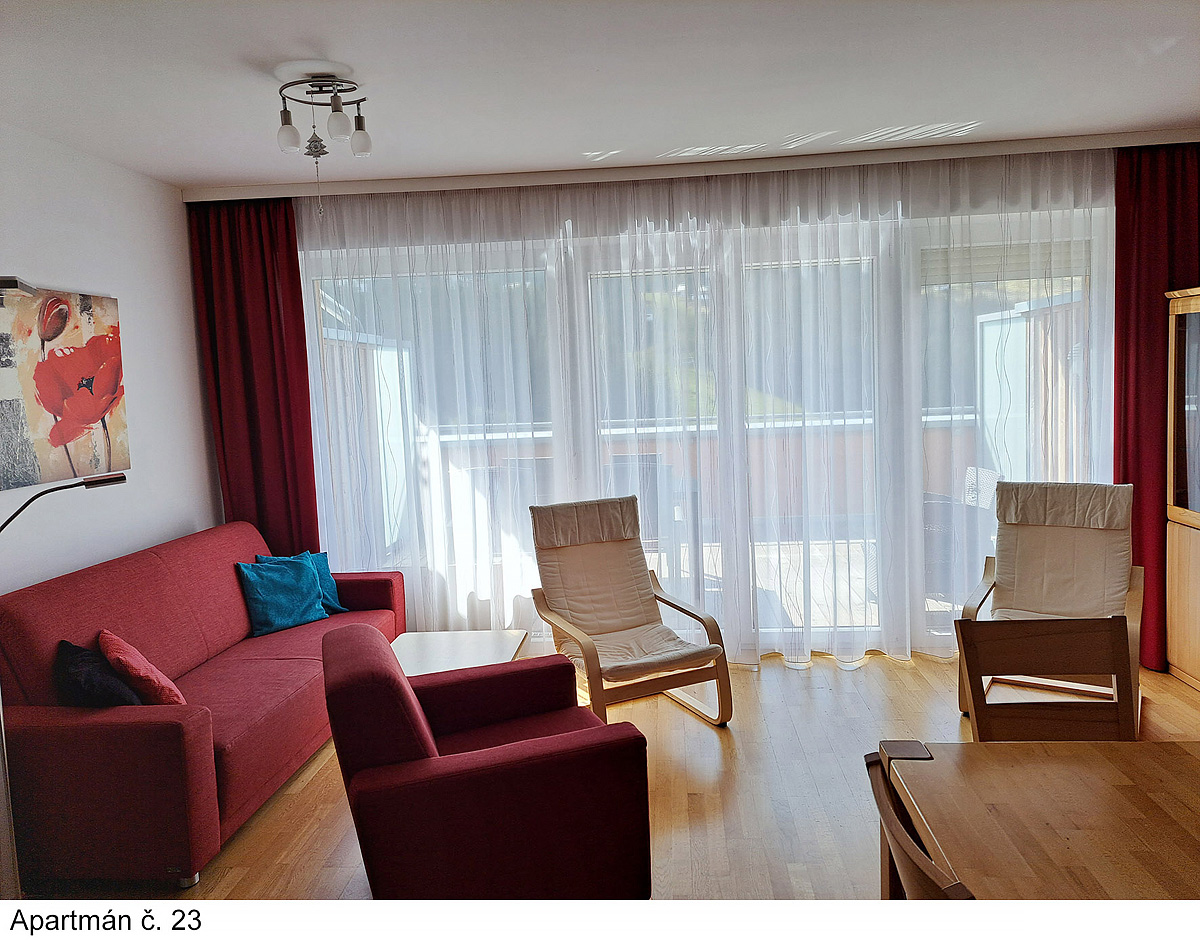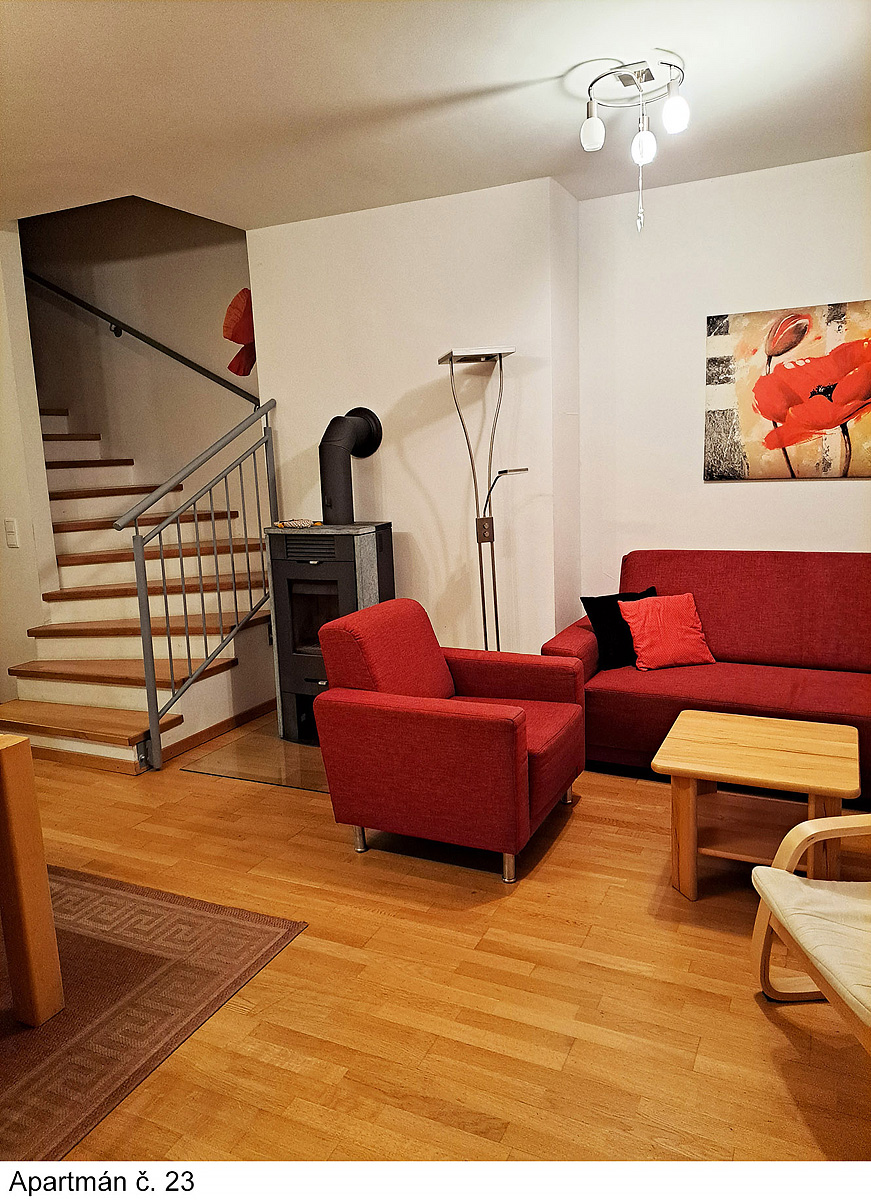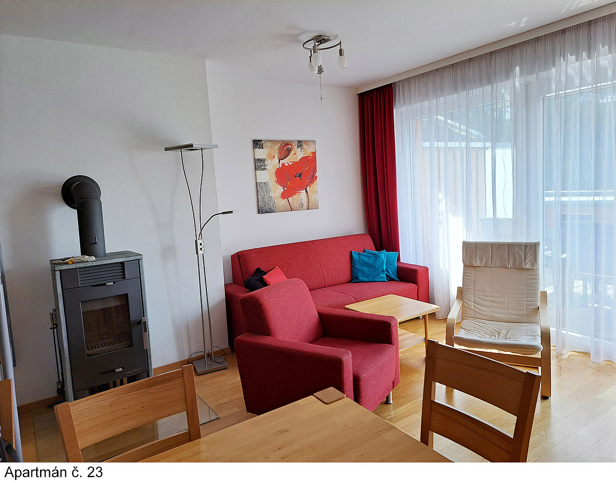 95 m² - 1 podlažie apartmánu: obývacia izba s kuchynským kútom a rozkladacím gaučom pre 2 osoby, sociálne zariadenie, terasa; 2. podlažie apartmánu: 2 spálne s manželskou posteľou, spálňa s 2 poschodovými posteľami, 3x sociálne zariadenie (vždy prístupné zo spálne), balkón