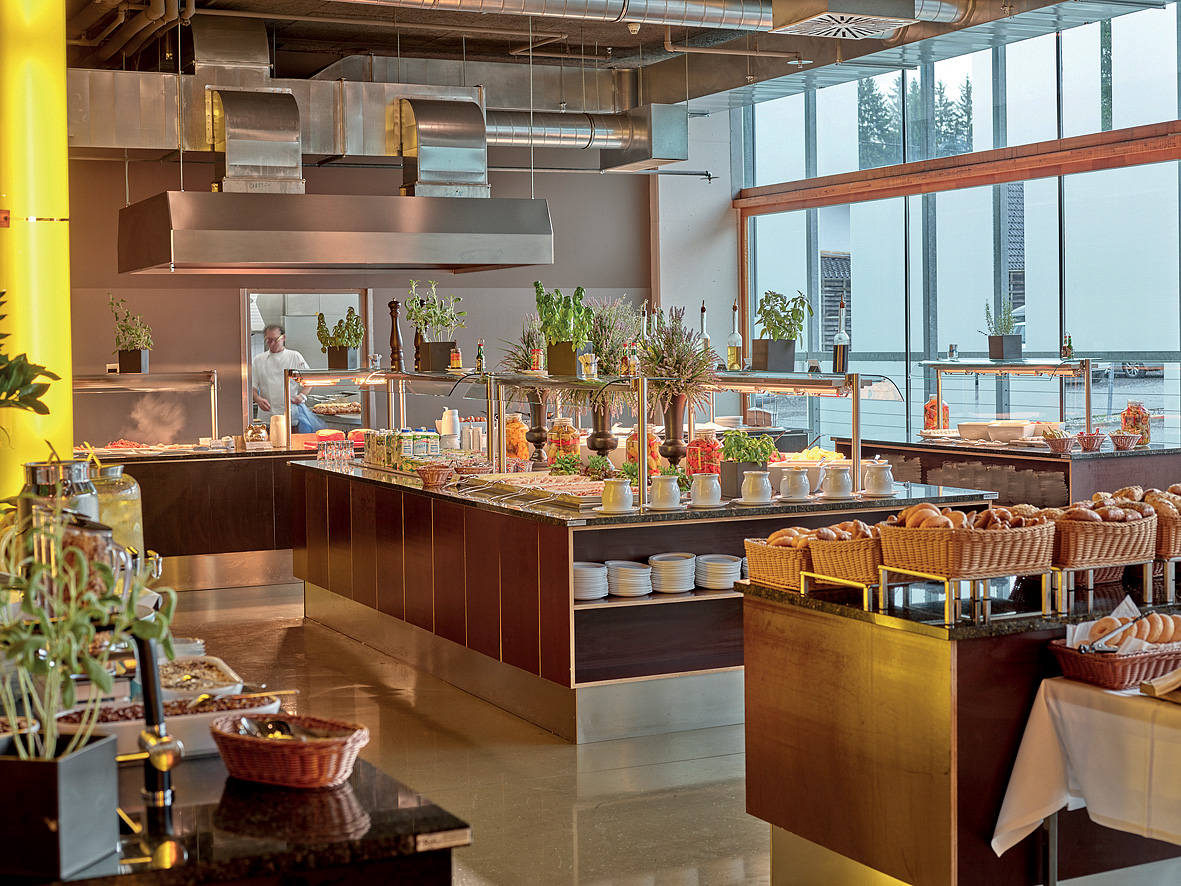 formou bufetu s výberom hlavného jedla s prílohou, predjedál, polievok, šalátov a dezertov, nápoje za poplatok