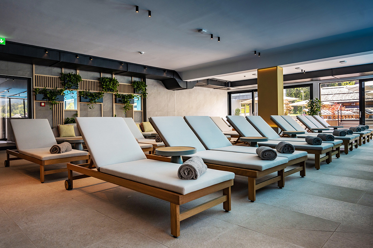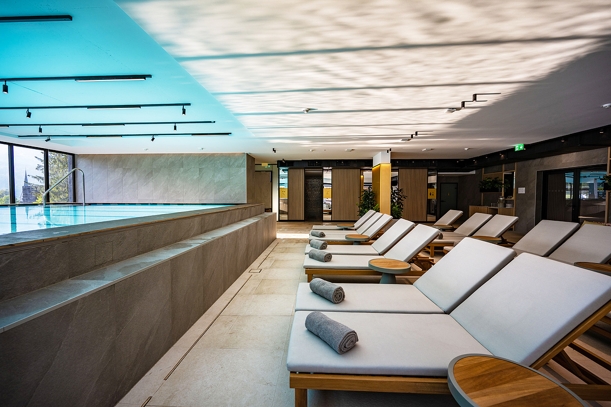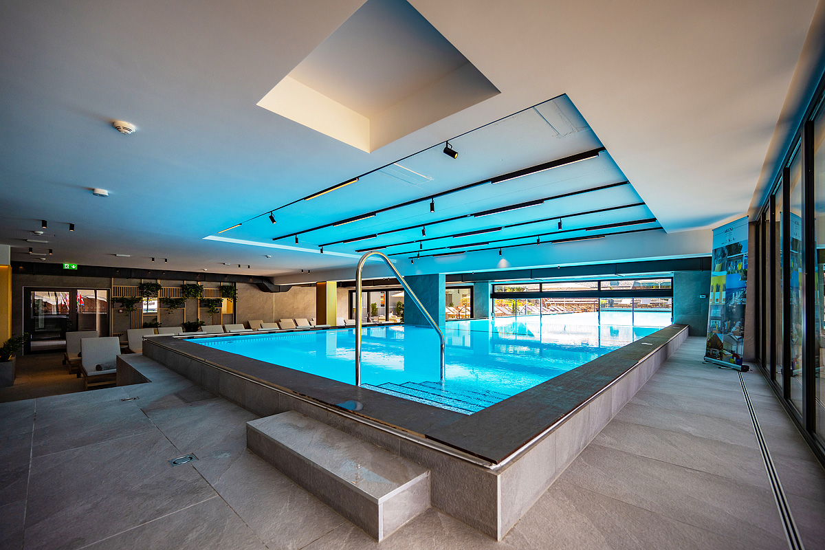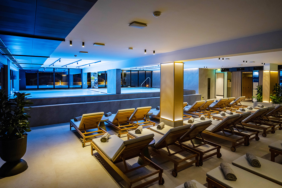 bazén, sauna, para, relaxačná miestnosť s lehátkami; profesionálna lezecká stena s vybavením, lezecká stena pre deti