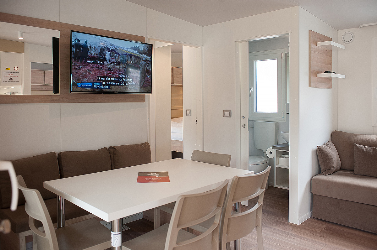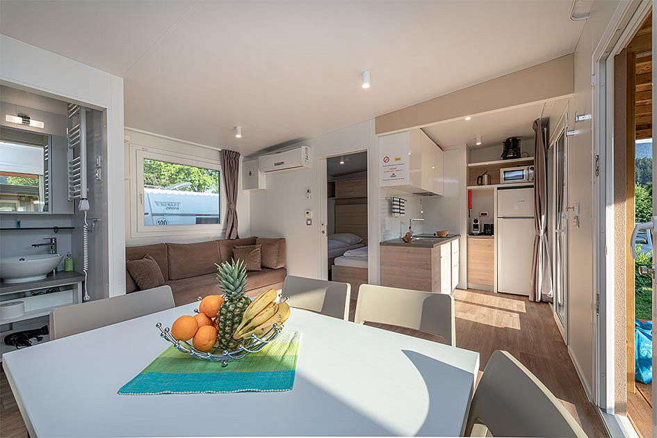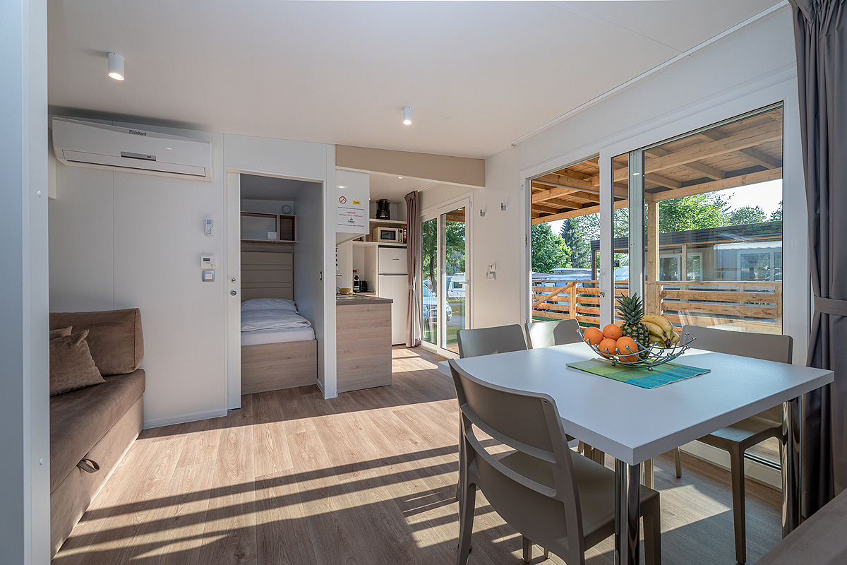 trilo 4+2 Cottage - bungalov, 1 spálňa s manželskou posteľou, 1 spálňa s 2 samostatnými lôžkami, obývacia izba s možnosťou prístelky formou rozkladacej pohovky pre až 2 deti do nedovŕšených 12 rokov, sociálne zariadenie, klimatizácia, vonkajšia terasa so záhradným nábytkom, max. obsaditeľnosť pre 4 dospelé osoby a 2 deti do nedovŕšených 12 rokov