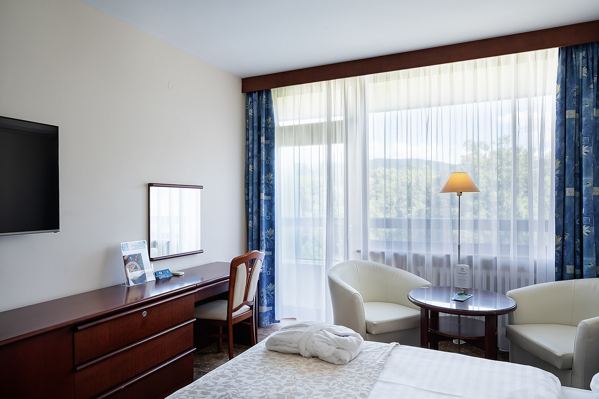 priestranná izba po rekonštrukcii s manželskou posteľou či 2 oddeliteľnými lôžkami, s možnosťou 1 prístelky pre dieťa do nedovŕšených 12 rokov, sociálne zariadenie s veľkou sprchou, balkón