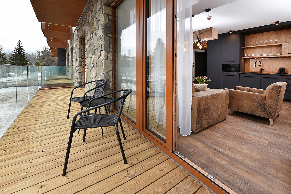 45 m² – otvorená spálňa s manželskou posteľou, priestranná obývacia izba s kuchynským kútom, krbom a rozkladacím gaučom pre 2 osoby, sociálne zariadenie so sprchou