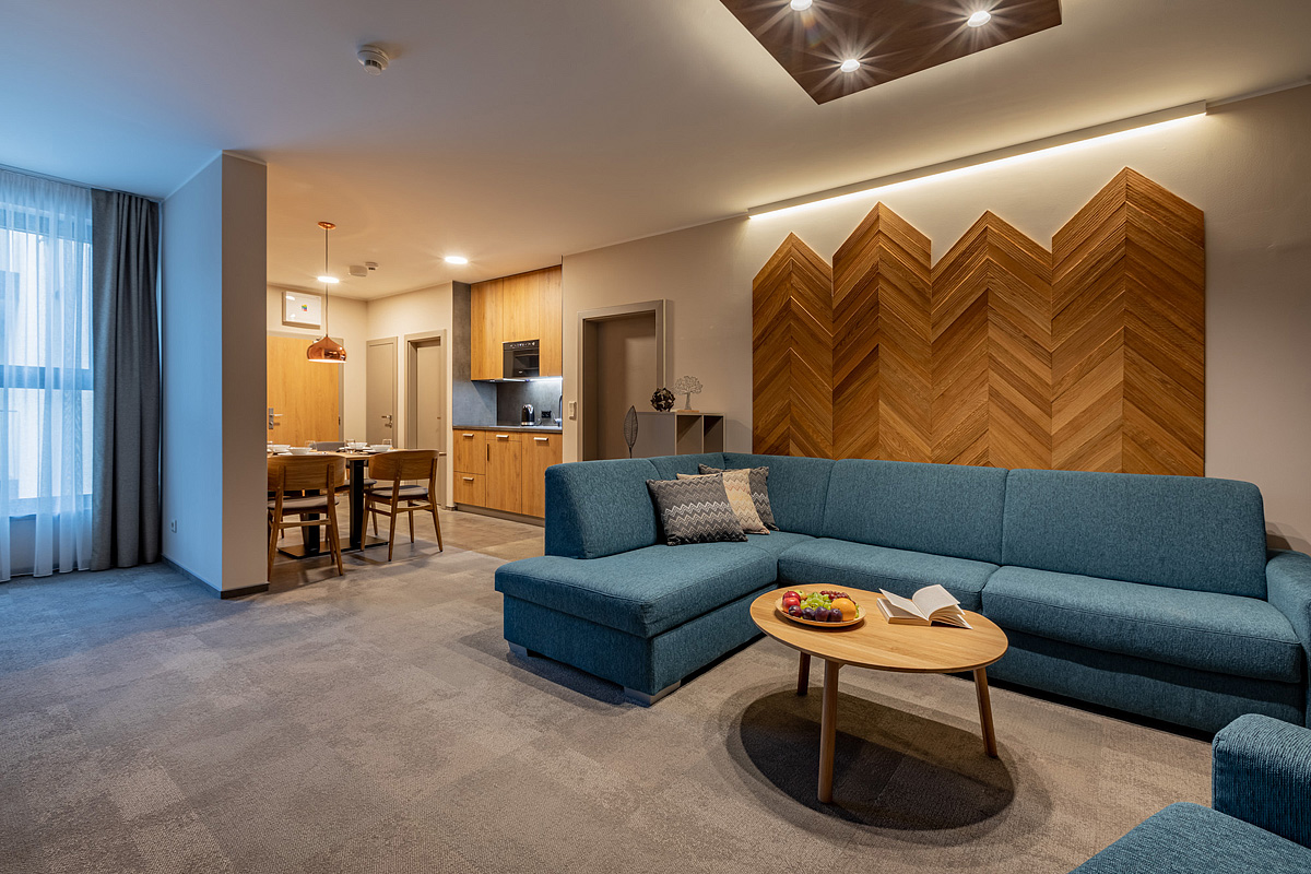 67 až 78 m² - dve spálne s manželskou posteľou či dvomi samostatnými lôžkami, obývacia izba s rozkladacím gaučom pre 2 osoby, kuchyňa, jedálenský kút, sociálne zariadenie so sprchou, niektoré apartmány s balkónom