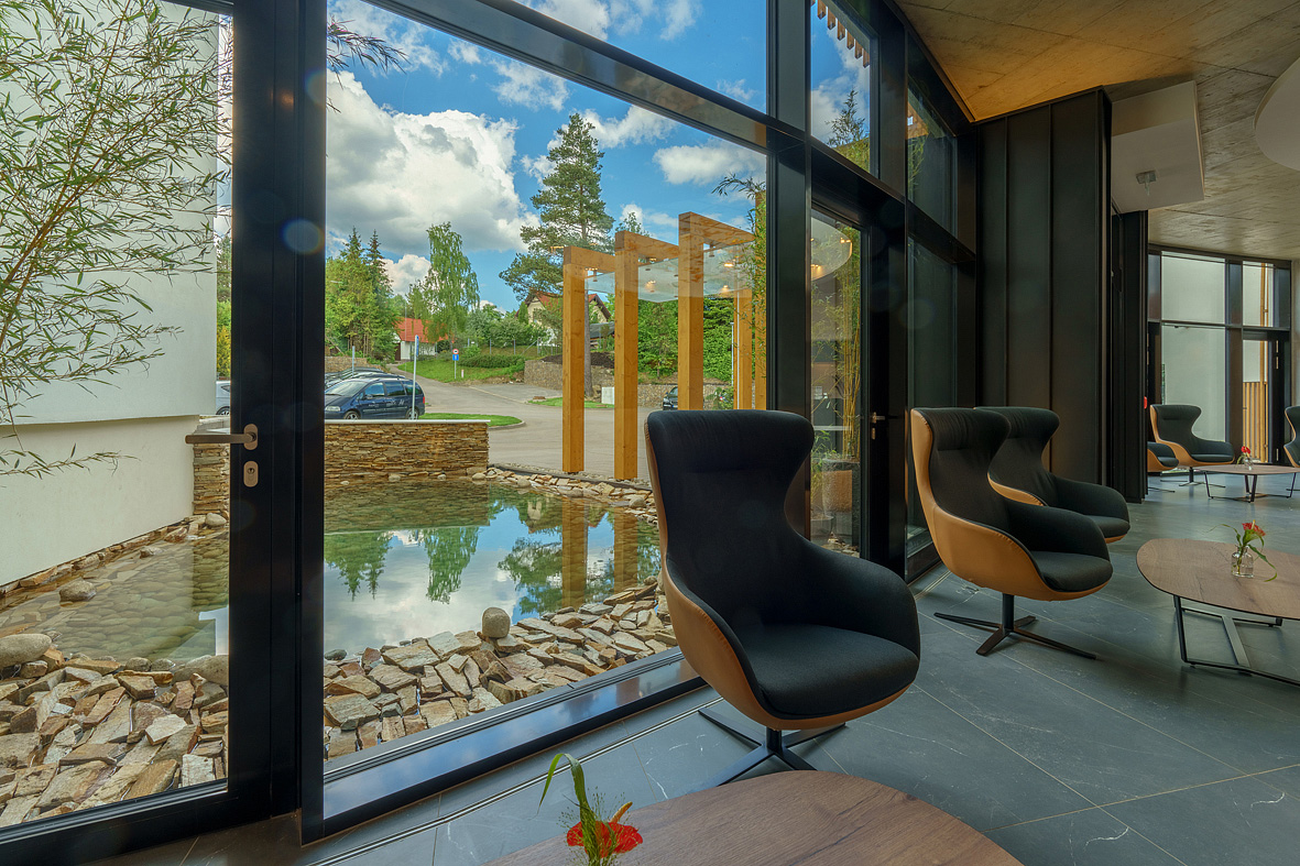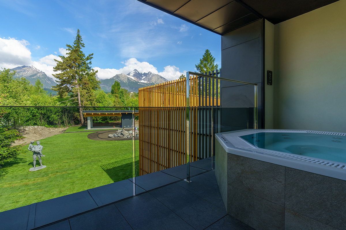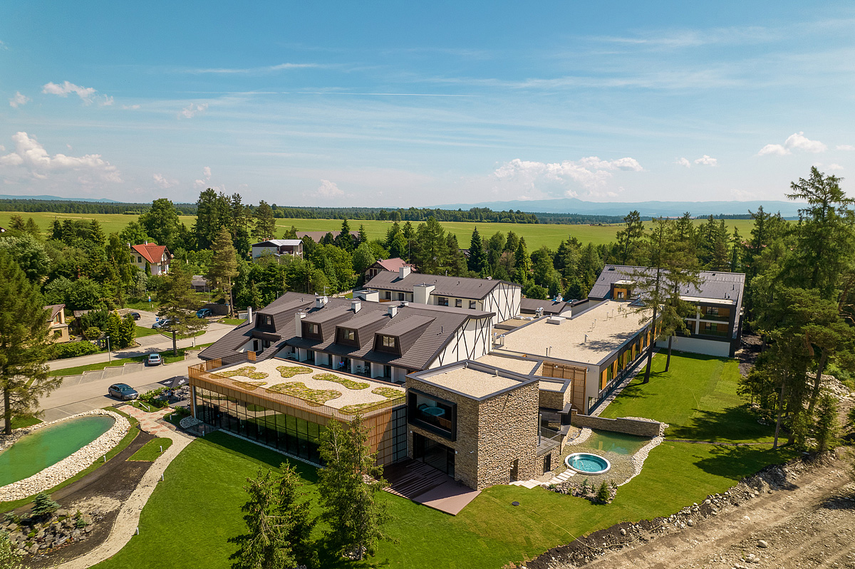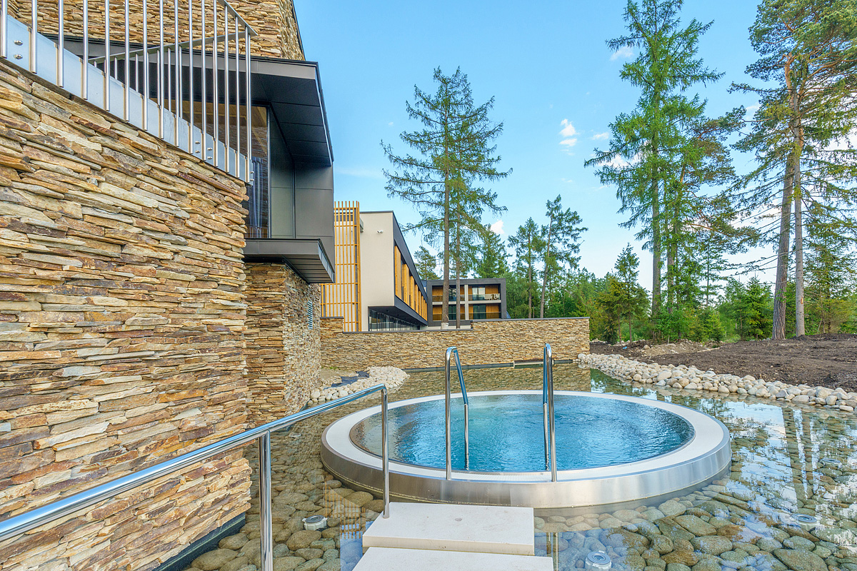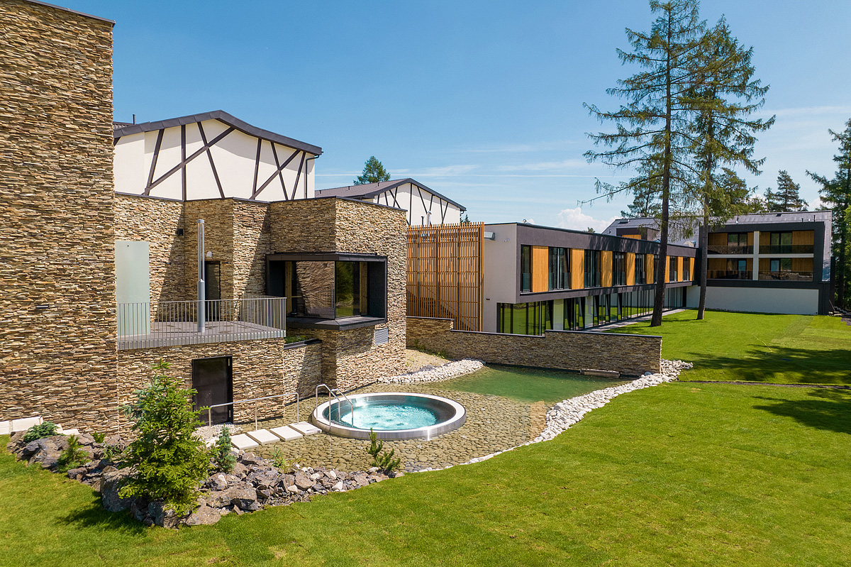 vnútorný bazén 17 x 9 m s masážnymi tryskami a vodným barom, vonkajšie jazierko, vonkajšia vírivka až pre 12 osôb, vnútorná vírivka, 2x fínska sauna, para, bylinná sauna, soľná sauna, ochladzovací bazén, ľadopád, zážitkové sprchy, relaxačná miestnosť, masáže*, privátne wellness* s výhľadmi na Tatry (vírivka až pre 5 osôb, presklenná fínska sauna)