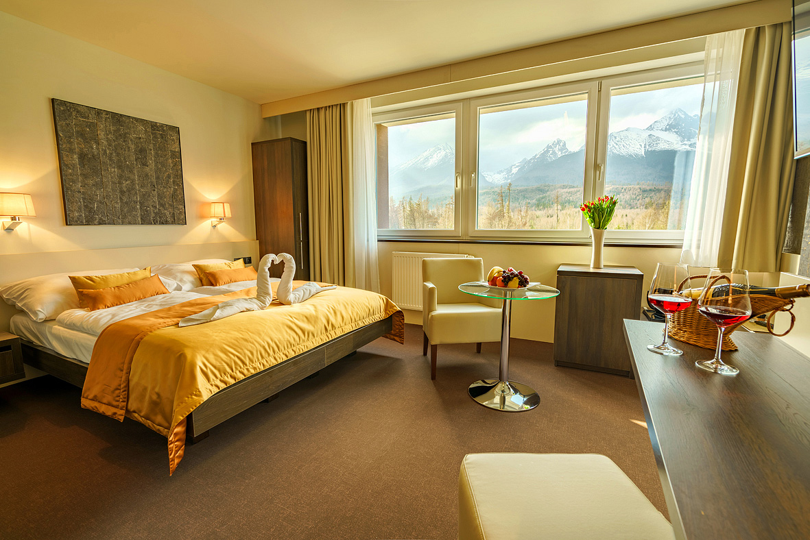 TV sat., telefón, wi-fi pripojenie k internetu, trezor, fén, antialergické prikrývky, ortopedické madrace, kozmetická súprava, minibar, rýchlovarná kanvica, čajový a kávový servis, župan