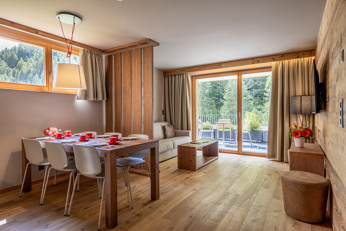 41 až 43 m² - 1 spálňa s manželskou posteľou s oddeliteľnými lôžkami (so šírkou 180 cm), obývacia izba s kuchynským kútom a rozkladacím gaučom (so šírkou 160 cm) pre 2 osoby, sociálne zariadenie, balkón s výhľadom na juh