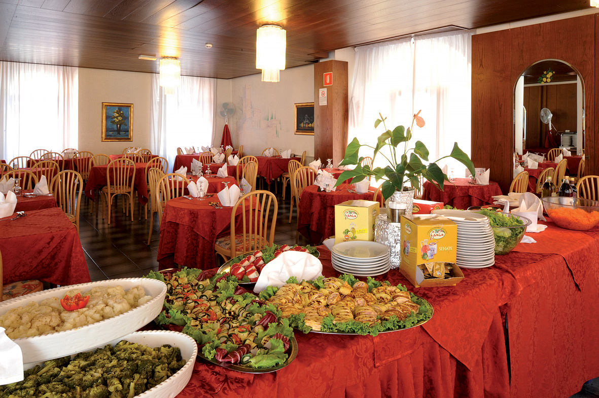 formou servírovaného 3chodového menu s výberom, spravidla servírované predjedlo či polievka, šalátový bufet, nápoje za poplatok