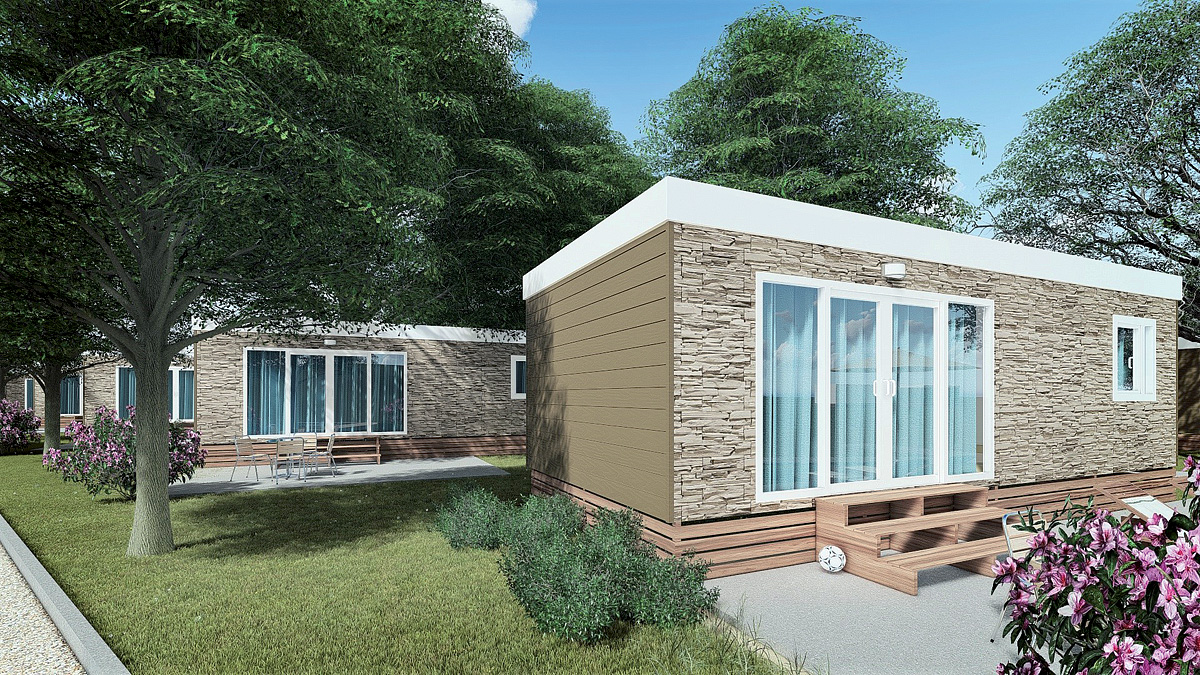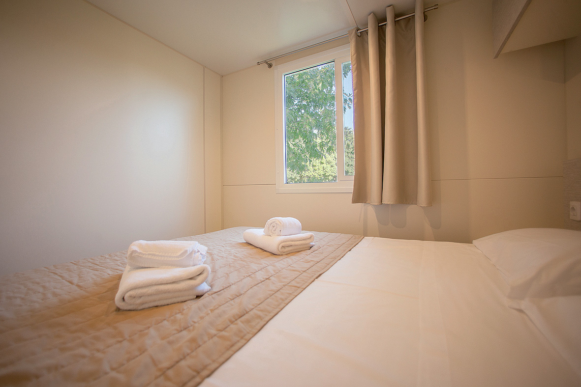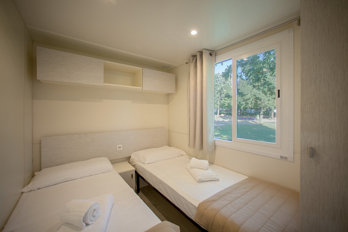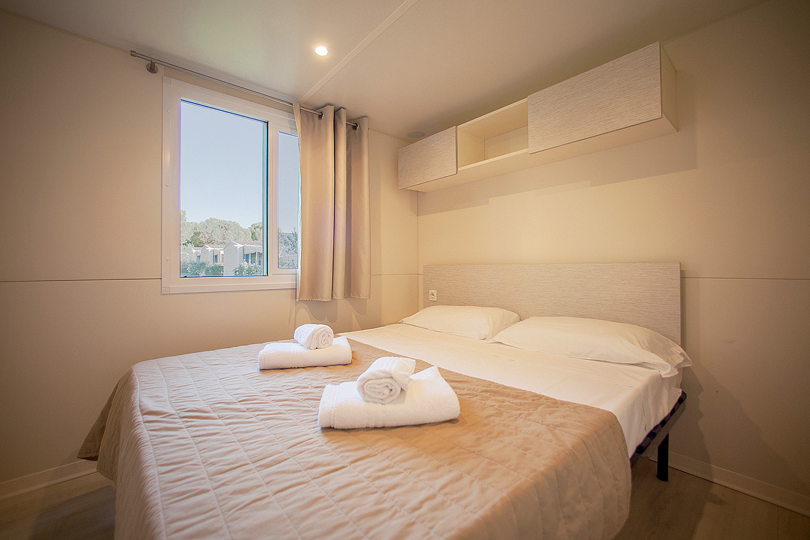 33 m² - 1 spálňa s manželskou posteľou, 1 spálňa s 2 samostatnými lôžkami, kuchyňský kút, sociálne zariadenie so sprchou, zastrešená terasa (10 až 15 m²) s posedením