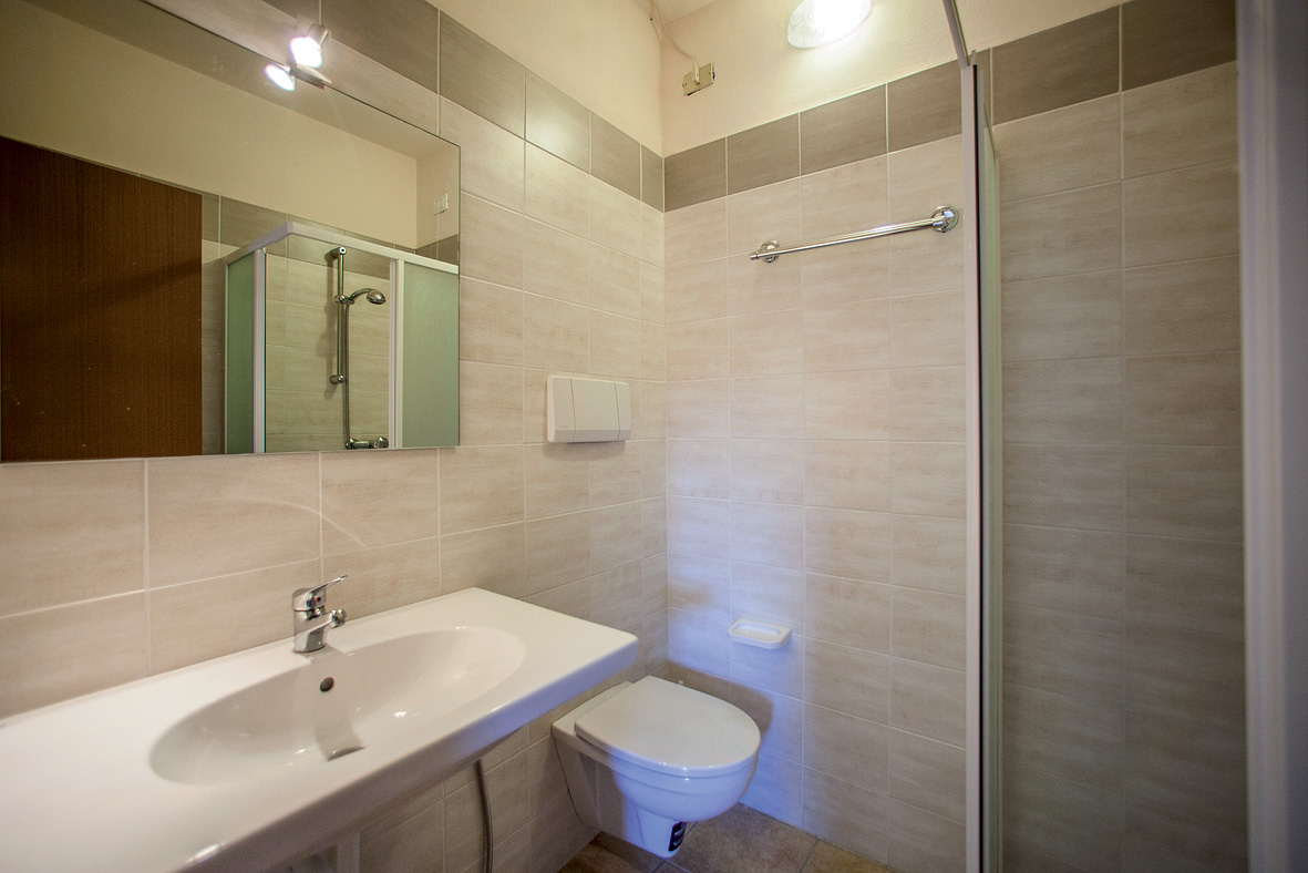 33 m² - 1 spálňa s manželskou posteľou, 2 malé spálne s 2 samostatnými lôžkami, kuchynský kút, sociálne zariadenie so sprchou, terasa s markízou a posedením; staršie vybavenie
