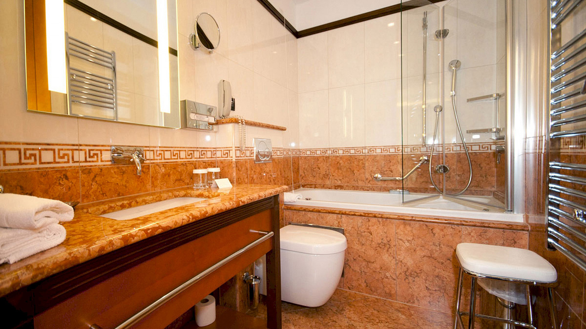 klimatizácia, TV sat., telefón, wi-fi pripojenie k internetu, fén, minibar*, trezor*, servis na prípravu kávy a čaja