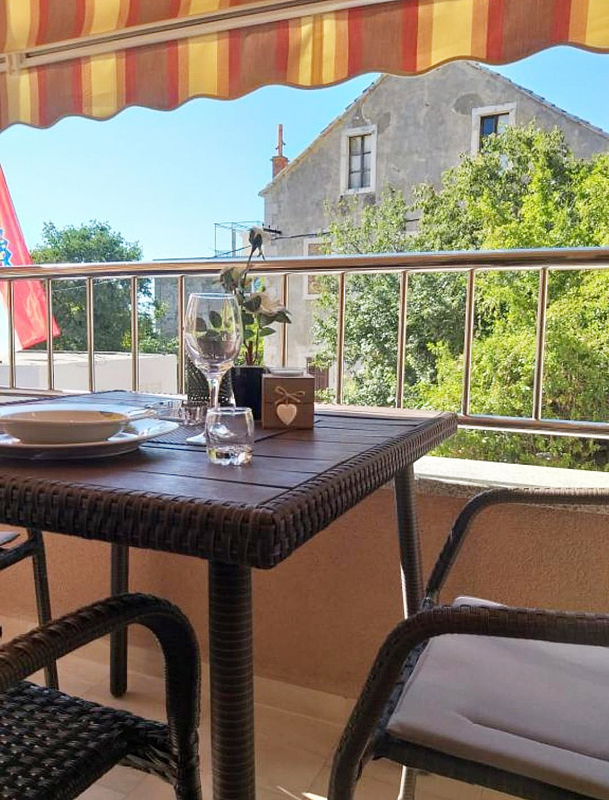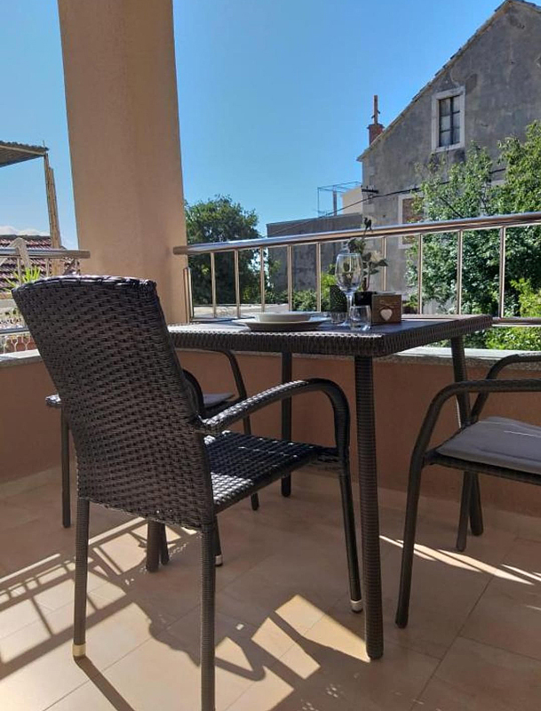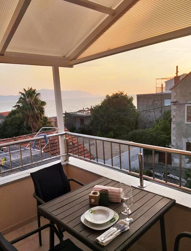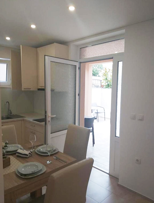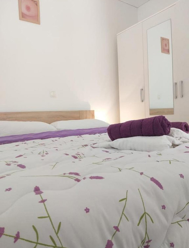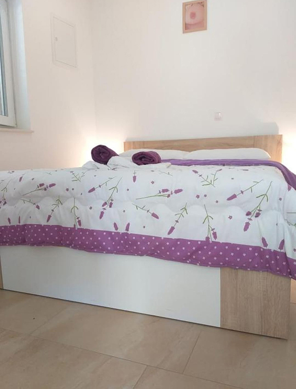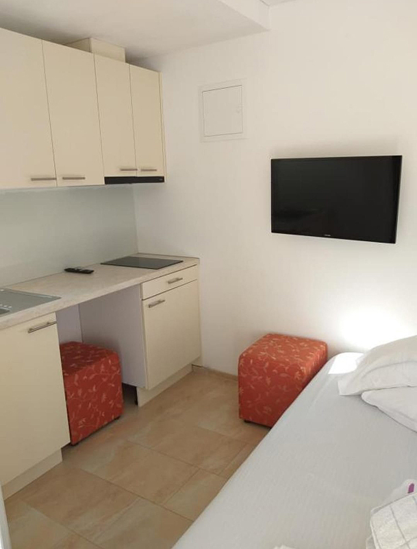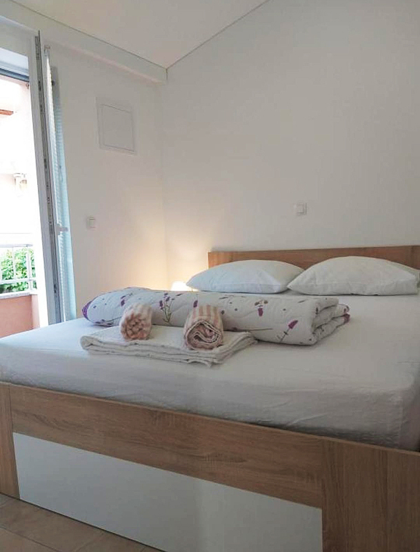 spálňa s manželskou posteľou, obývacia izba s vybaveným kuchynským kútom a prístelkou formou rozkladacieho gauča pre jednu dospelú osobu alebo dve deti do nedovŕšených 12 rokov, sociálne zariadenie so sprchou, dva balkóny – jeden orientovaný do ulice, druhý s výhľadom na more