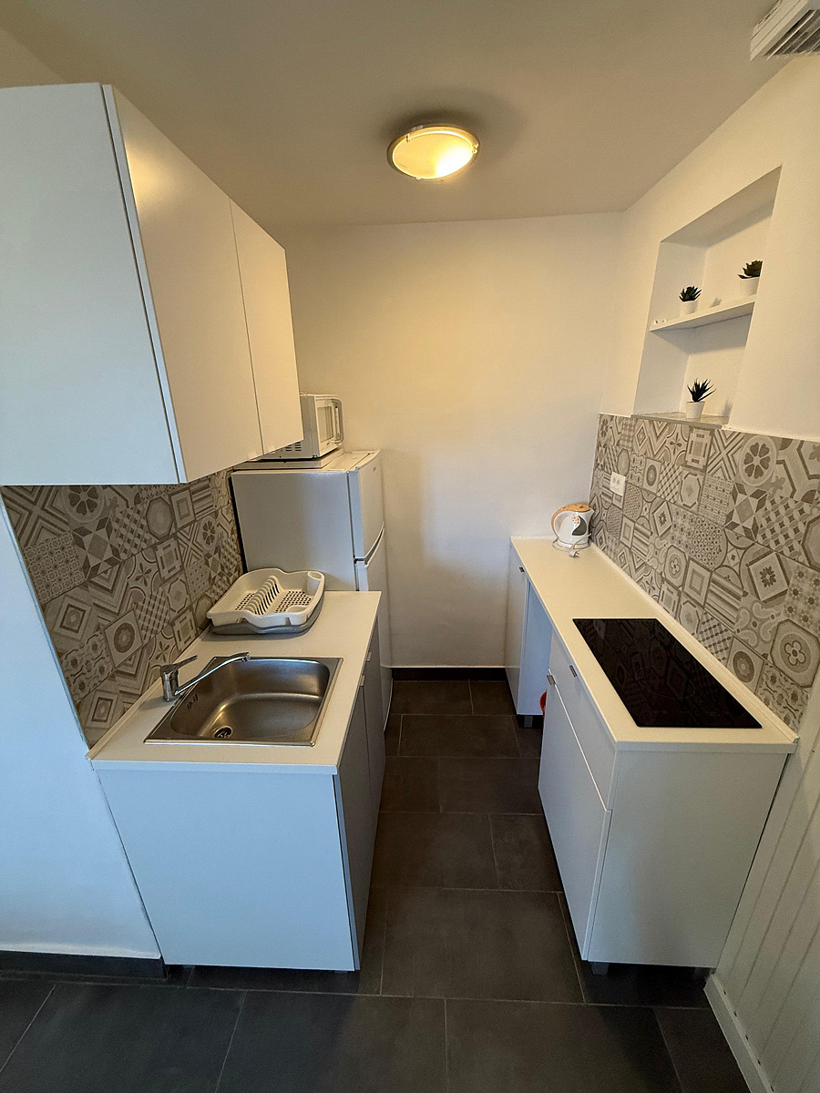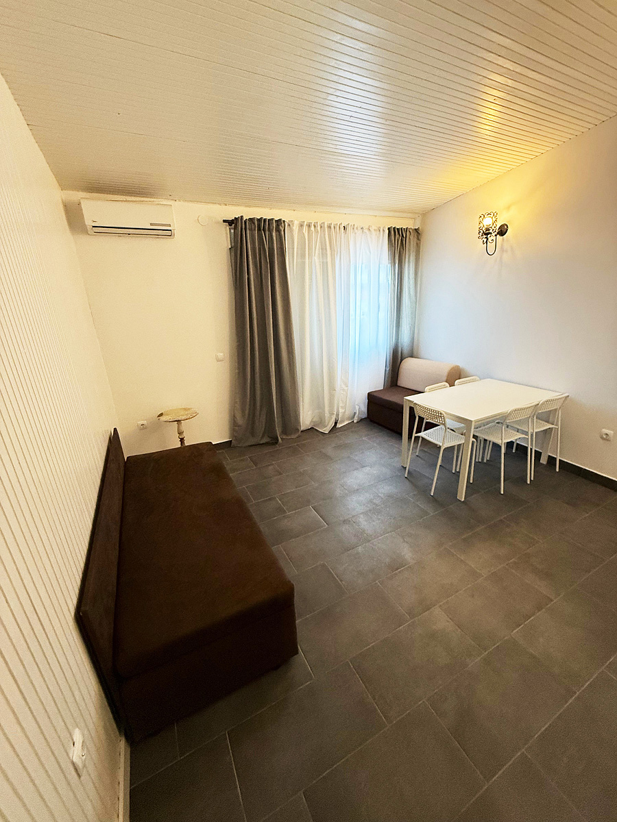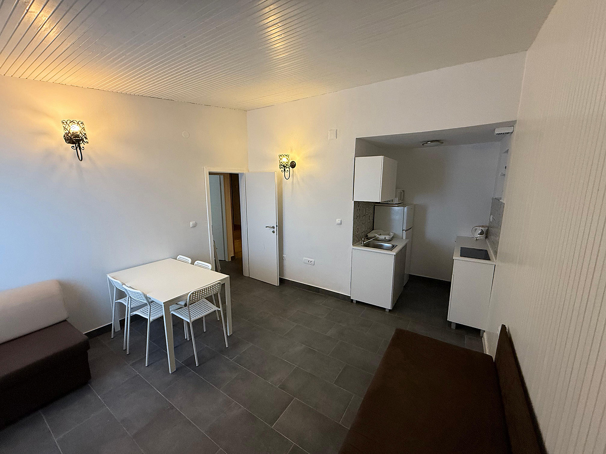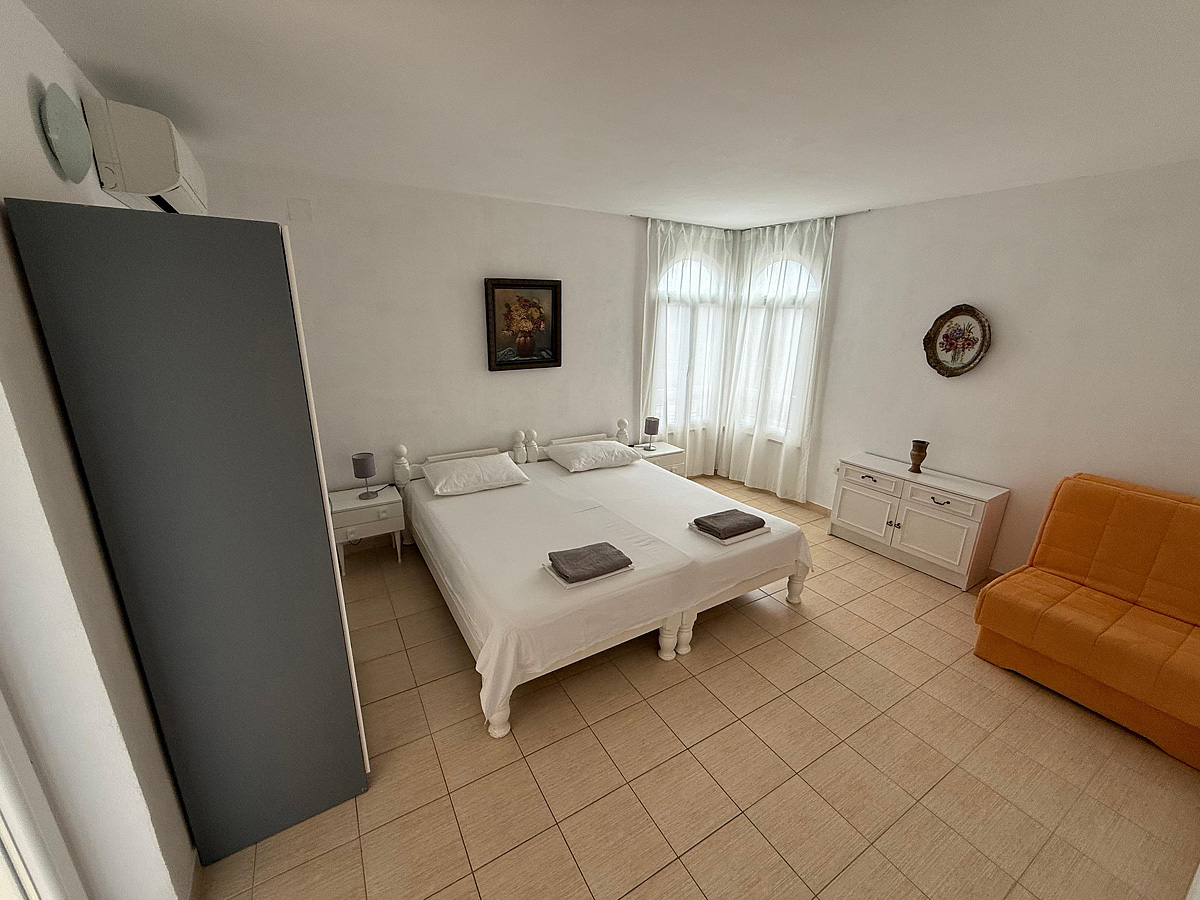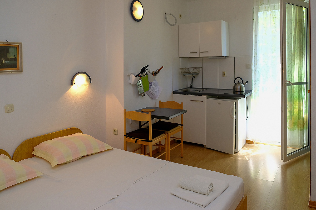 štúdio s dvomi pevnými lôžkami a jednou prístelkou, kuchynským kútom, balkónom a klimatizáciou, možnosť 3. lôžka formou prístelky pre deti do 12 rokov