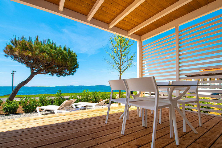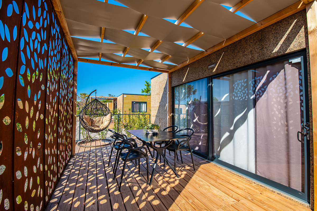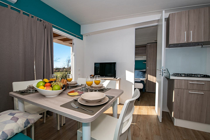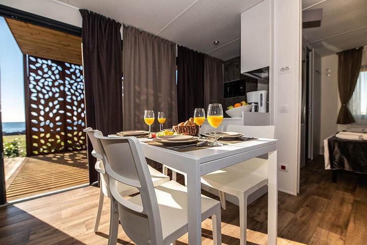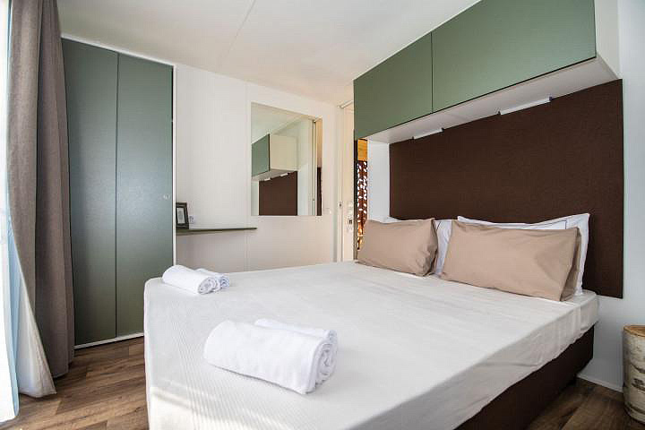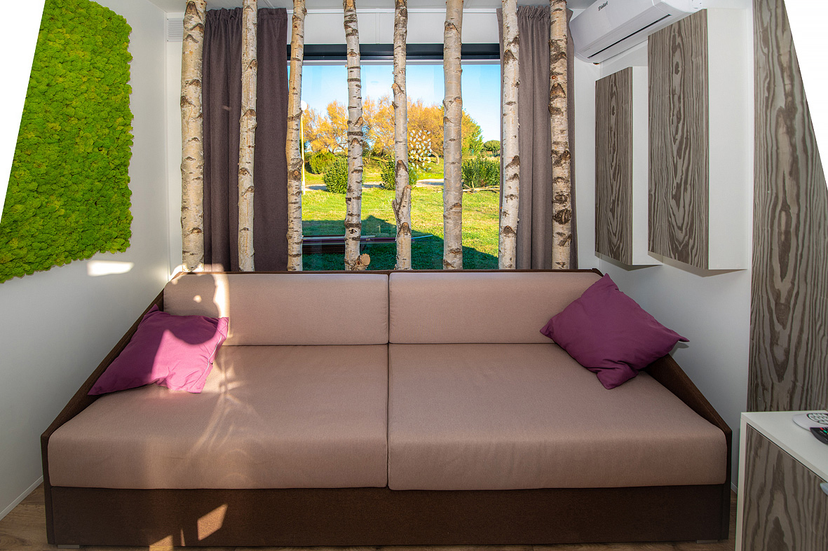 Mobile home Green 4+1 - 37 m² - 1 spálňa s manželskou posteľou (160 x 200), 1 spálňa s dvomi samostnanými lôžkami (80 x 195), obývacia izba s kuchynským kútom a rozkladacia pohovka pre dieťa do nedovŕšených 12 rokov, 2 sociálne zariadenie so sprchou, terasa s výhľadom na záhradu