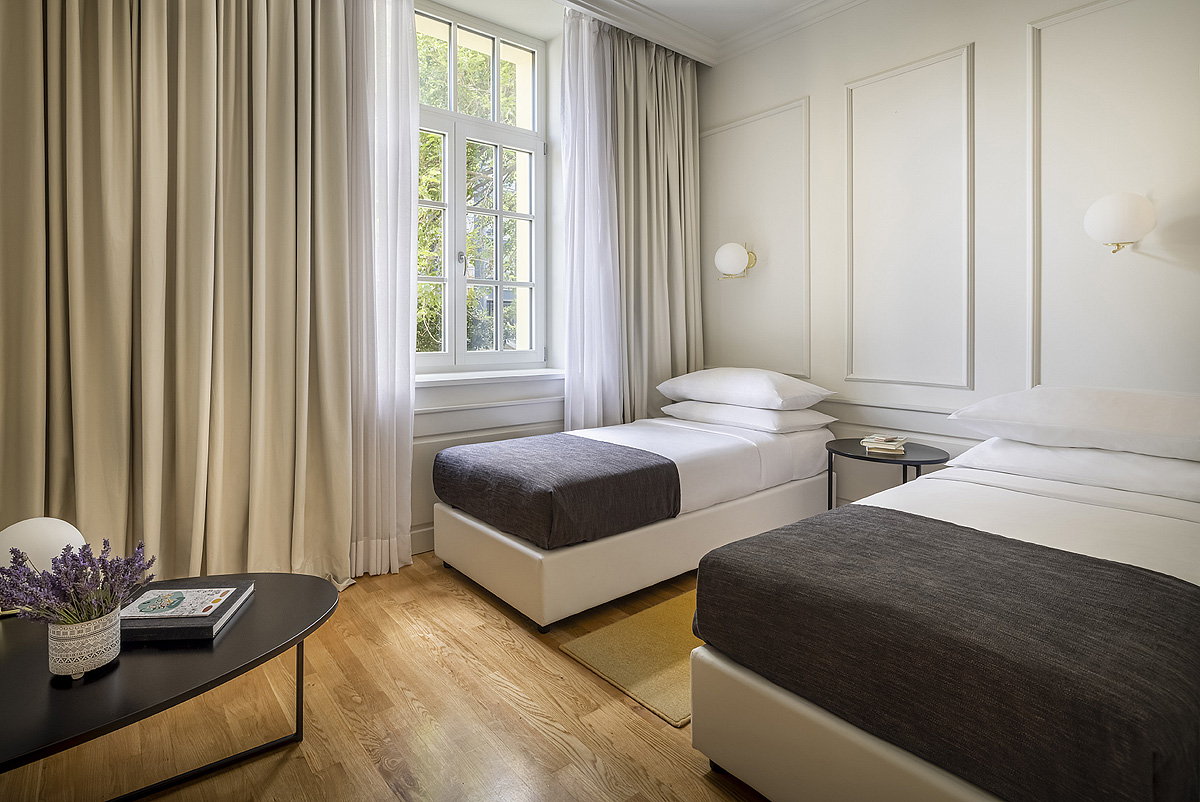 dve prepojené izby, každá s manželskou posteľou a výsuvnou prísteľkou pre dieťa do nedovŕšených 15 rokov, sociálne zariadenie so sprchou či vaňou, balkón orientovaný na park