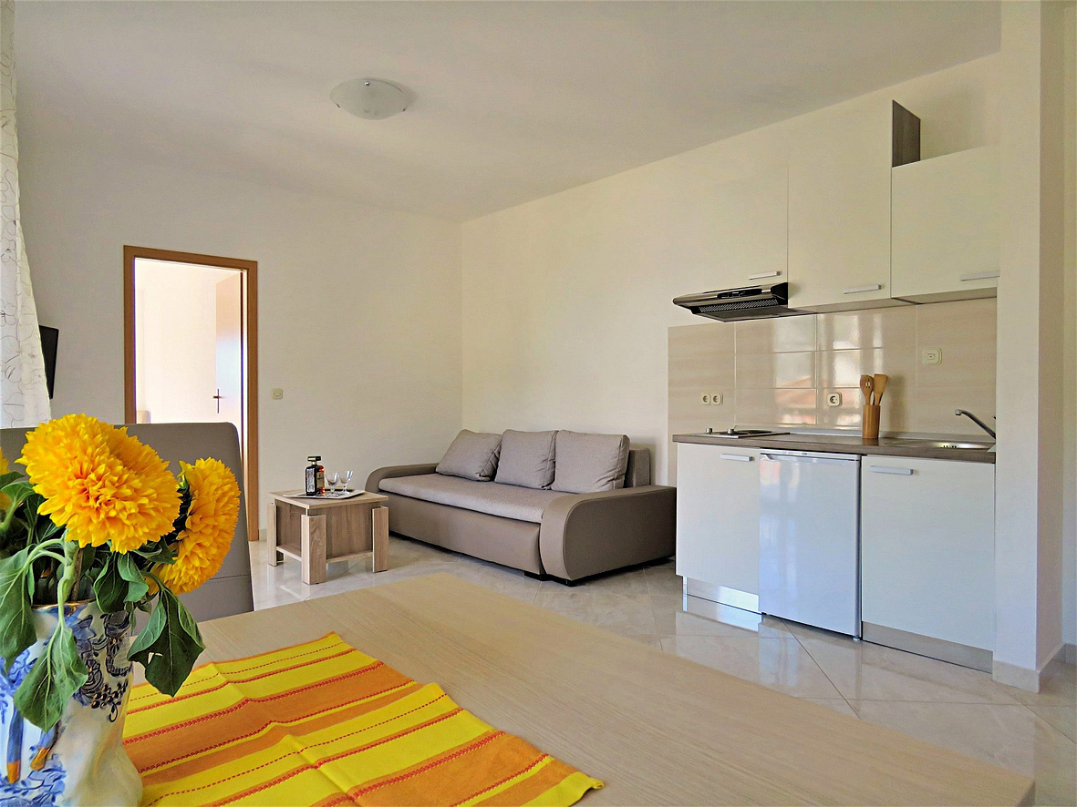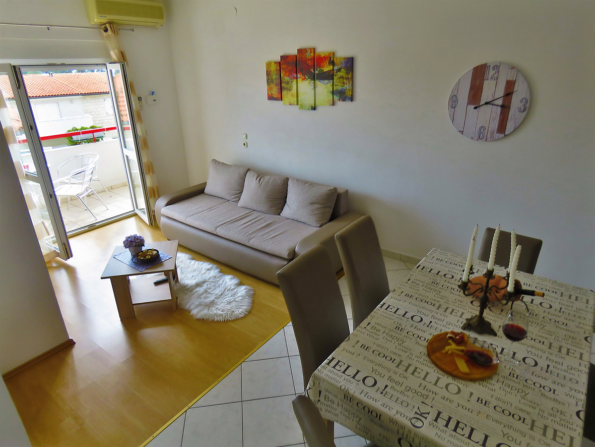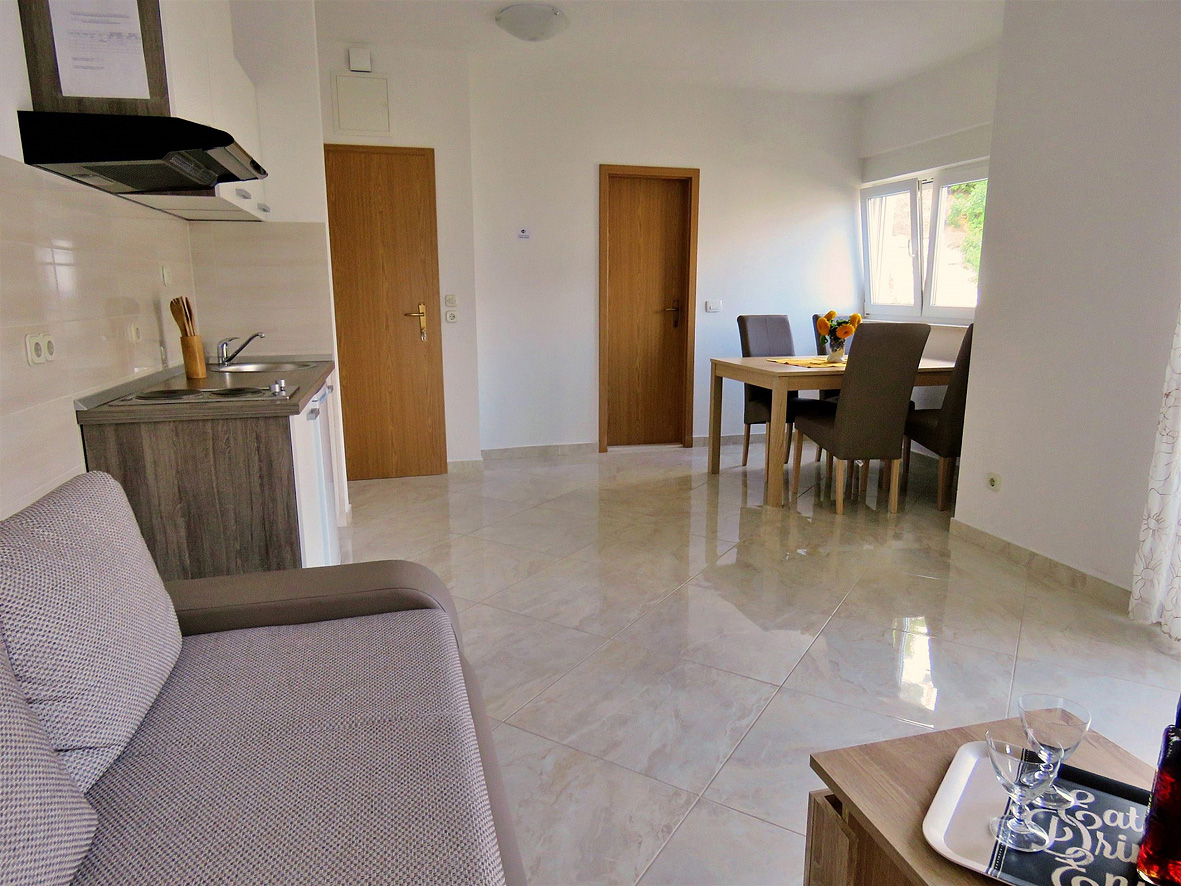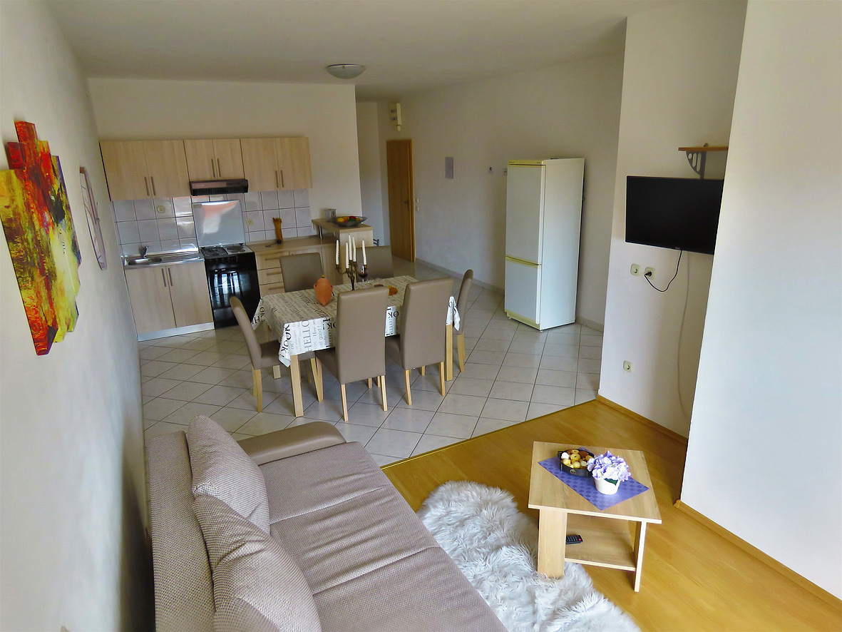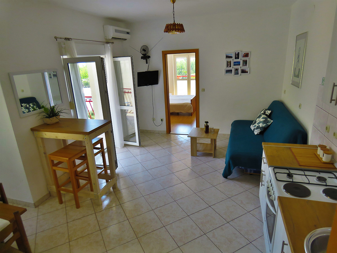 trilo 4+2 - 2x izba s manželskou posteľou, obývacia izba a rozkladací gauč pre 2 deti do nedovŕšených 15 rokov, kuchynský kút, 2 x sociálne zariadenie so sprchou, 2x balkón, jeden s výhľadom na more