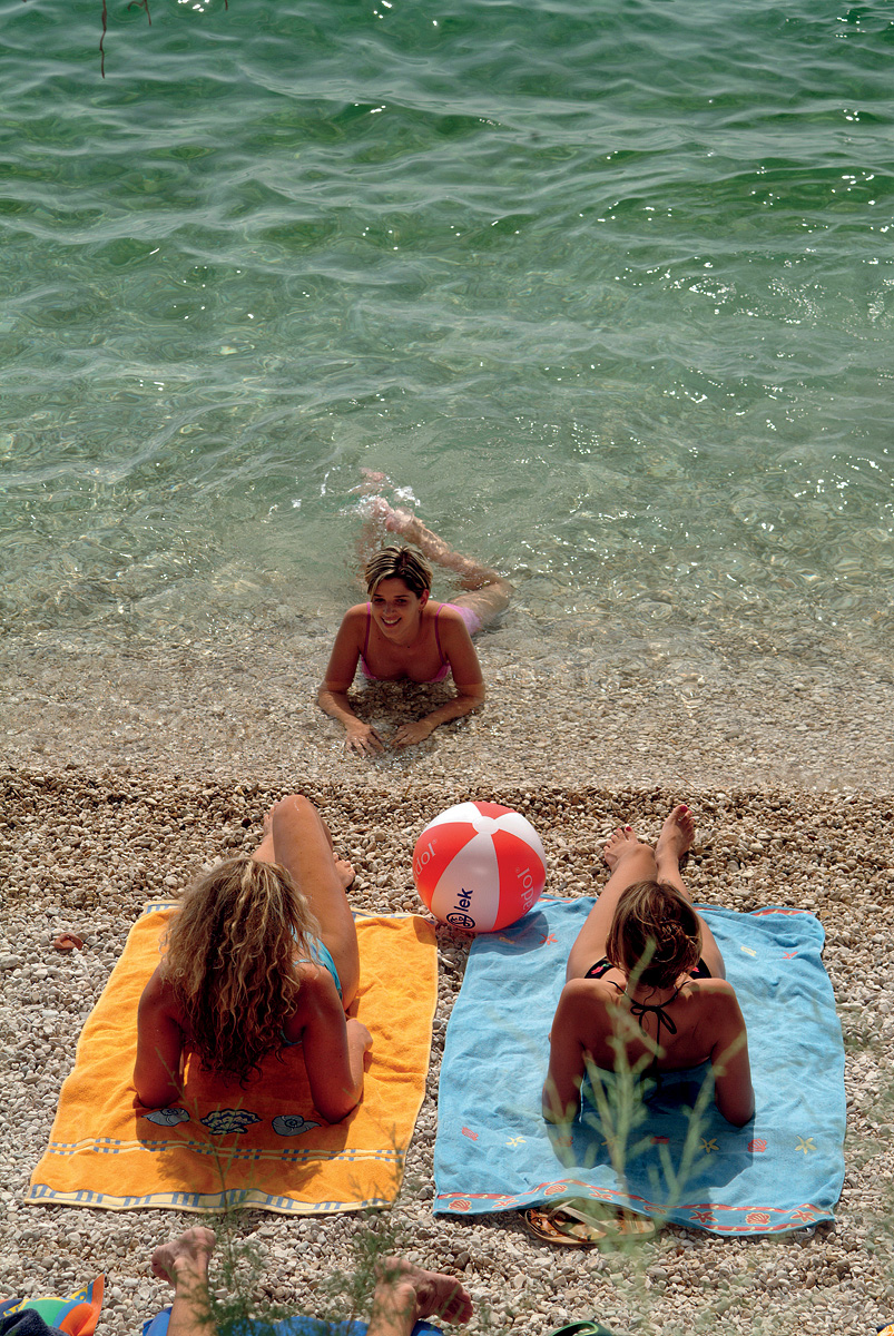 poloha v tieni borovicového hája, len cez ulicu od mora s pozvoľne sa zvažujúcou plážou