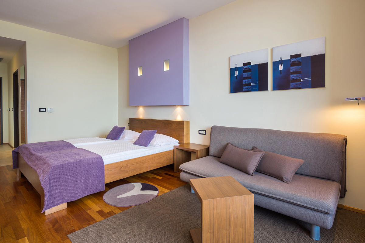 18 m² - izba s manželskou posteľou alebo 2 samostatnými lôžkami, rozkladacia pohovka pre dieťa do nedovŕšených 16 rokov, sociálne zariadenie so sprchou, balkón alebo terasa
