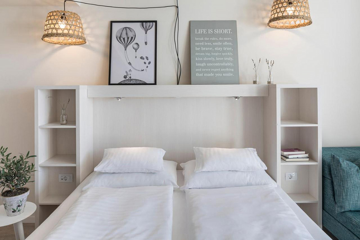 22 m² - izba s manželskou posteľou a s možnosťou prístelky formou rozkladacieho kresla pre dieťa do nedovŕšených 12 rokov, sociálne zariadenie so sprchou, balkón orientovaný k moru