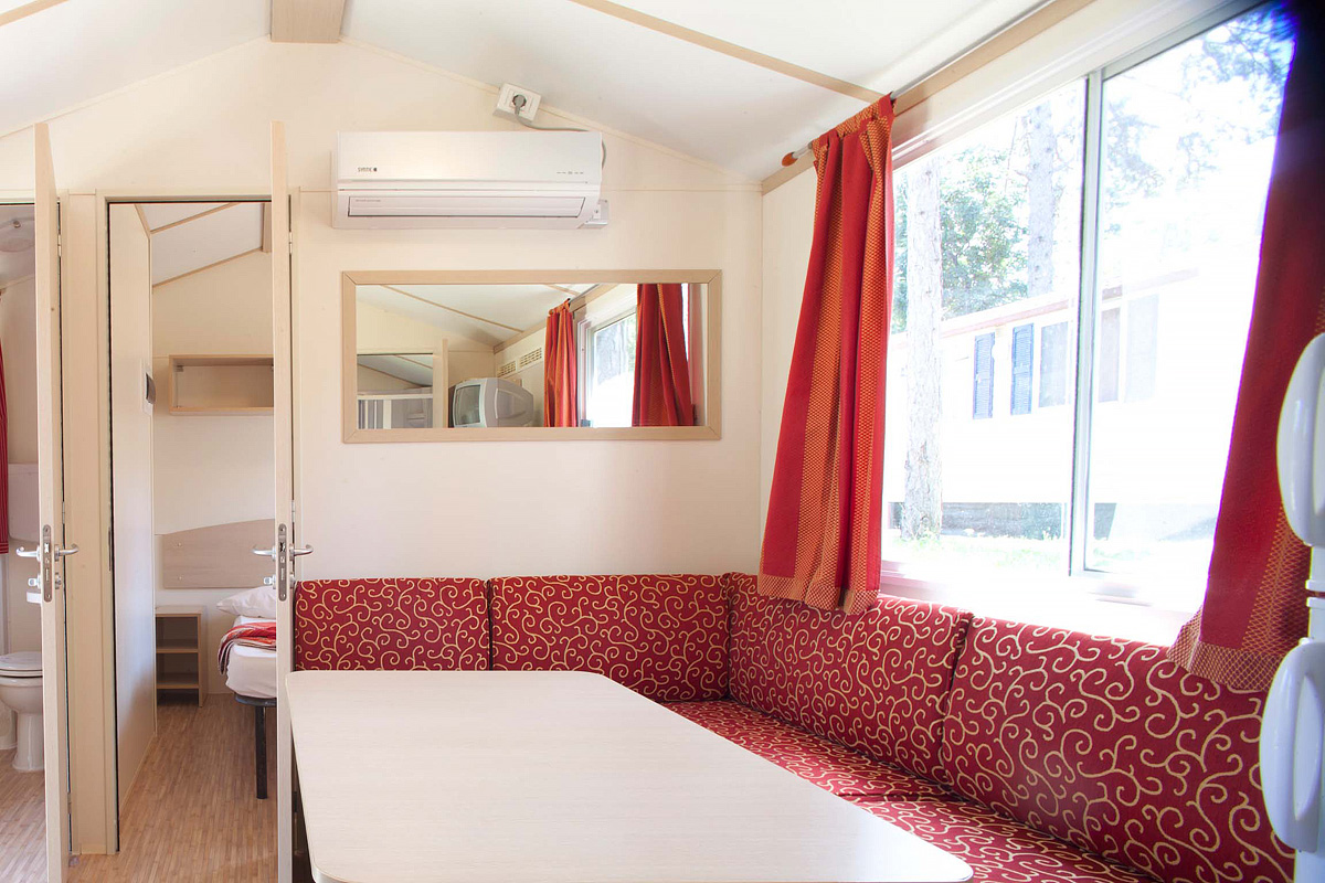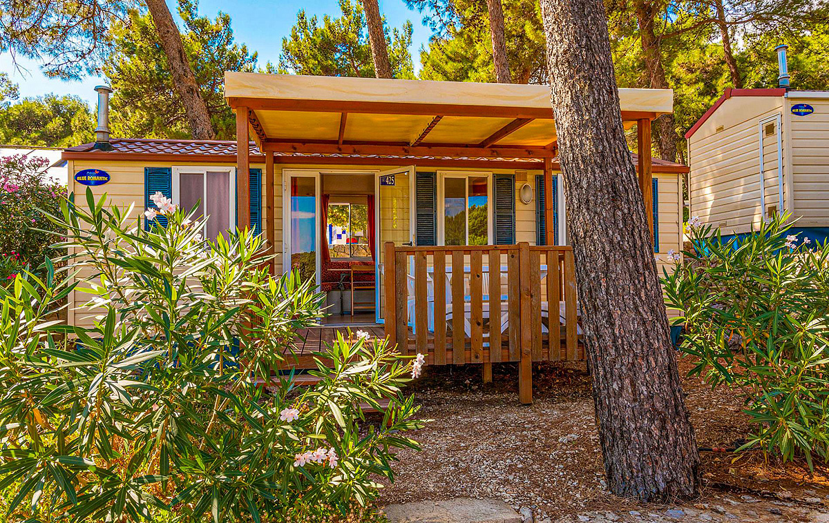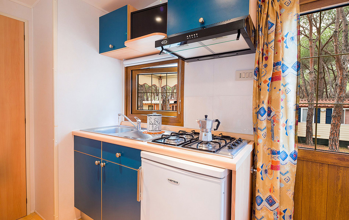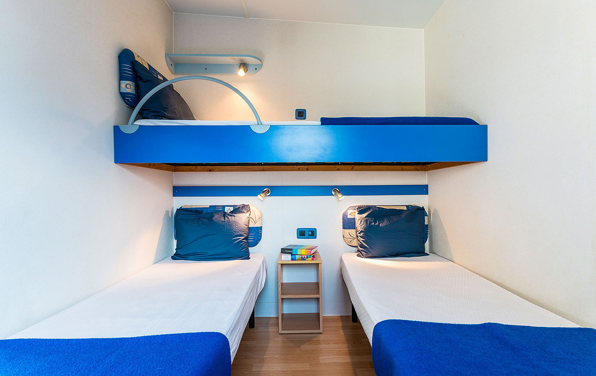 MH Blu Romantic 4+2 - 24 m² - 1 spálňa s manželskou posteľou, 1 spálňa s 2 samostatnými lôžkami a závesným lôžkom (pre dieťa do 150 cm a 60 kg), obývacia izba s kuchynským kútom a lavicou rozložiteľnou na lôžko, sociálne zariadenie so sprchou, samostatné WC, krytá terasa so záhradným nábytkom; maximálna obsadenosť je 4 dospelí a 2 deti do nedovŕšených 12 rokov