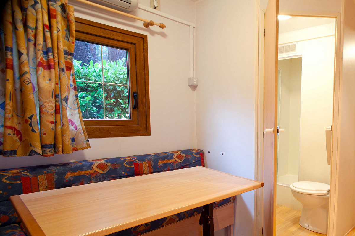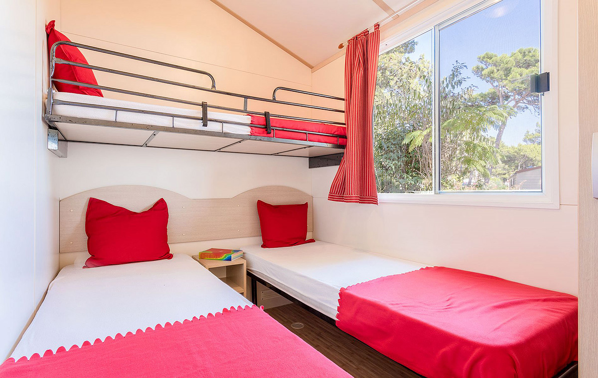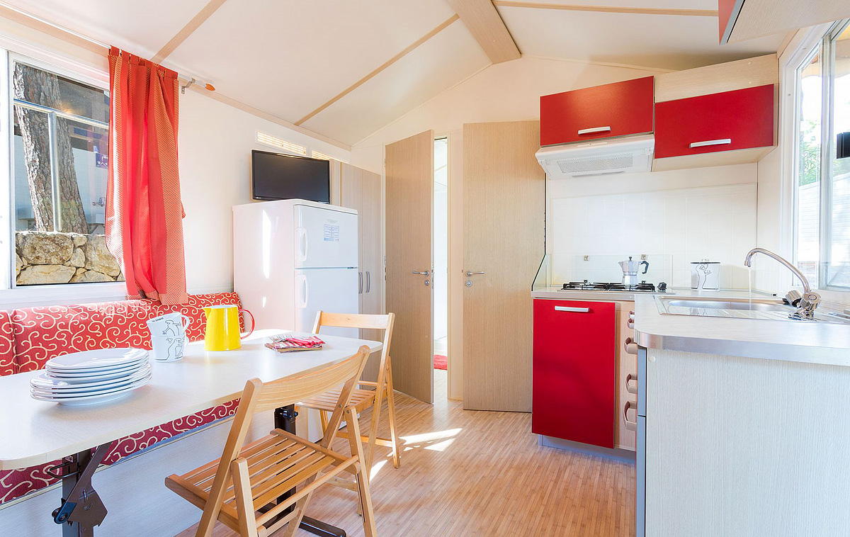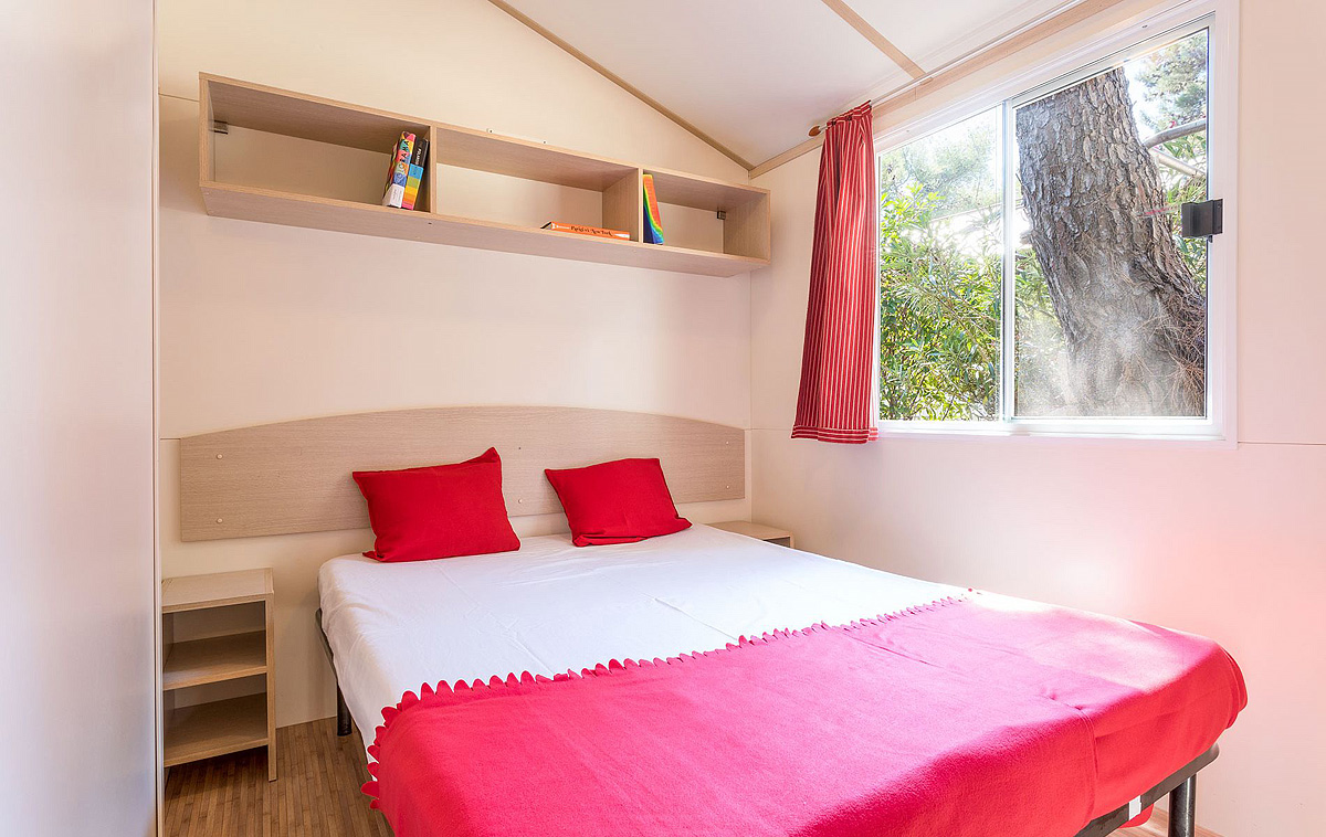 MH Blu Romantic 4+2 - 24 m² - 1 spálňa s manželskou posteľou, 1 spálňa s 2 samostatnými lôžkami a závesným lôžkom (pre dieťa do 150 cm a 60 kg), obývacia izba s kuchynským kútom a lavicou rozložiteľnou na lôžko, sociálne zariadenie so sprchou, samostatné WC, krytá terasa so záhradným nábytkom; maximálna obsadenosť je 4 dospelí a 2 deti do nedovŕšených 12 rokov