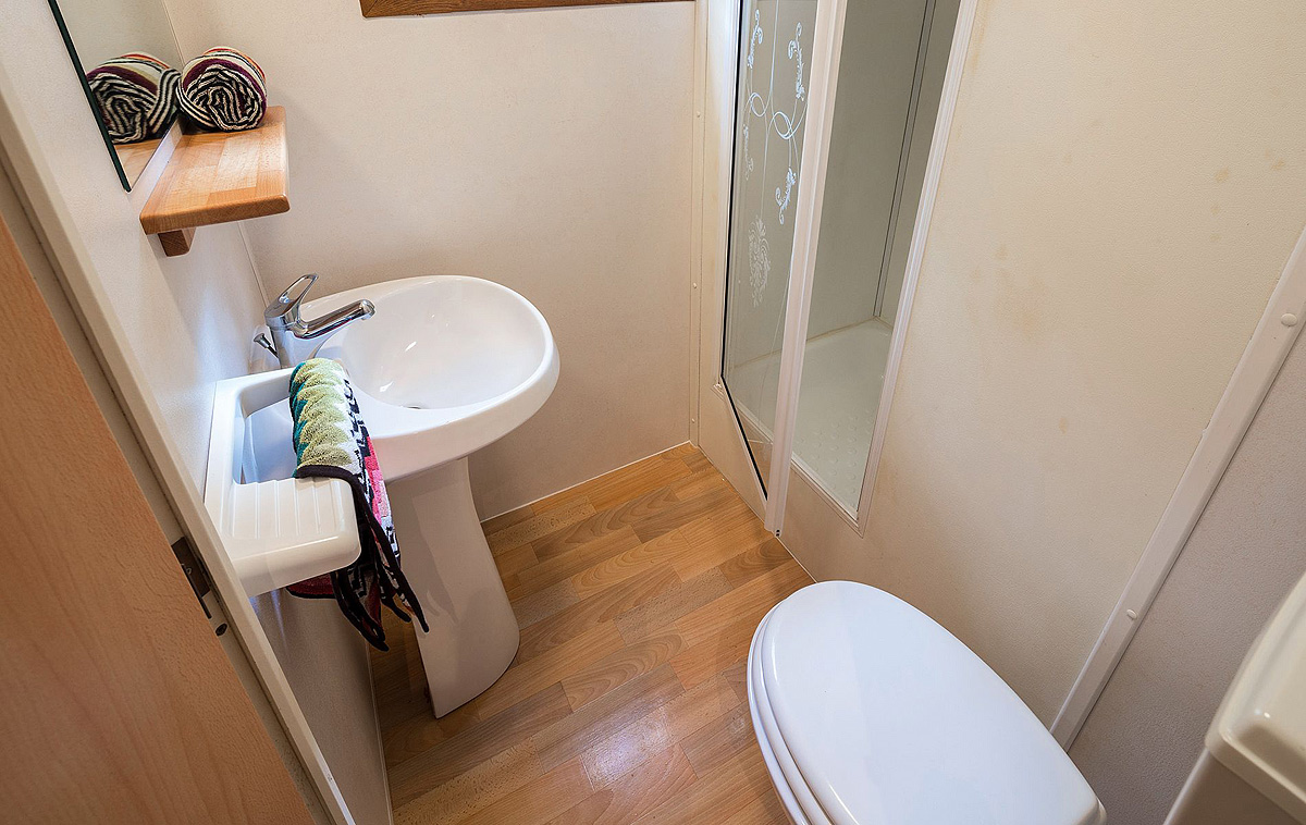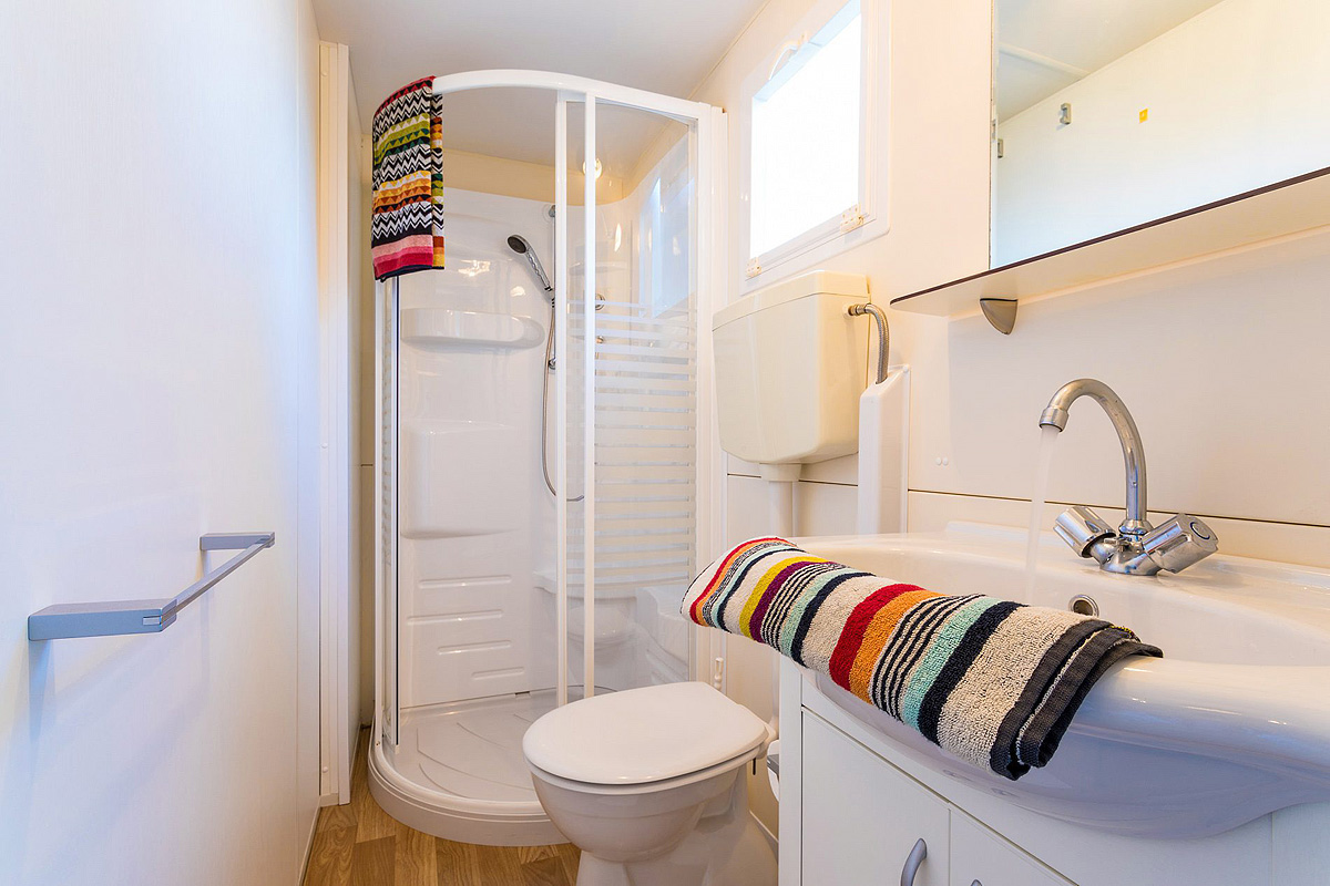 MH Comfort Plus 4 - 22 m² - 1 spálňa s manželskou posteľou, 1 spálňa s 2 samostatnými lôžkami, obývacia izba s kuchynským kútom, sociálne zariadenie so sprchou, samostatné WC, terasa so záhradným nábytkom