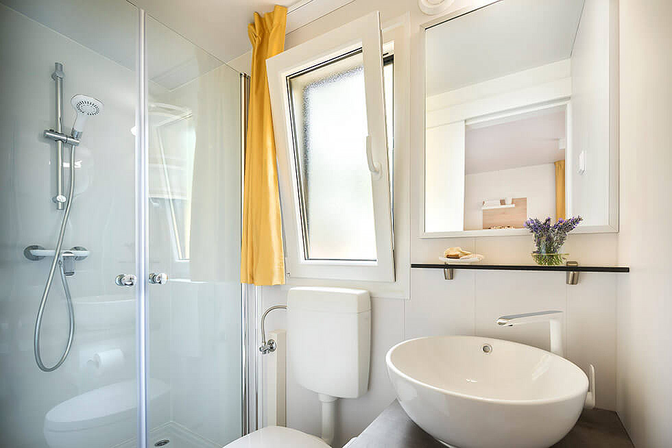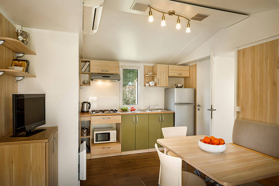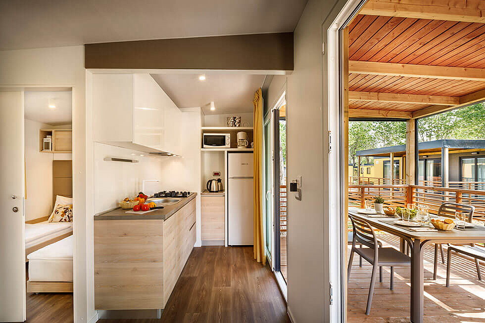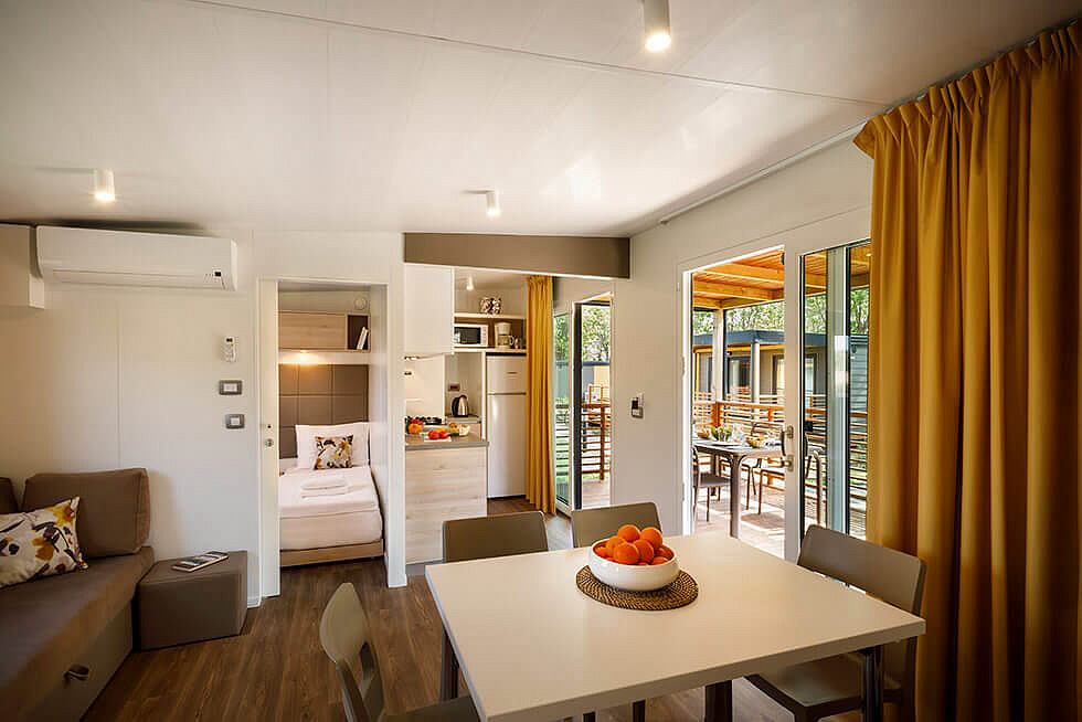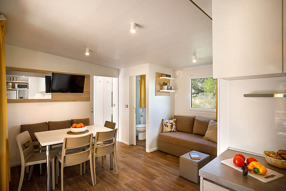 34 m² - 1 spálňa s manželskou posteľou, 1 spálňa s 2 samostatnými lôžkami, obývacia izba s kuchynským kútom a lavicou rozložiteľnou na lôžko pre dve deti do nedovŕšených 12 rokov, sociálne zariadenie so sprchou, sociálne zariadenie so sprchou a WC, krytá terasa so záhradným nábytkom; maximálna obsaditeľnosť sú 4 dospelí a 2 deti do nedovŕšených 12 rokov