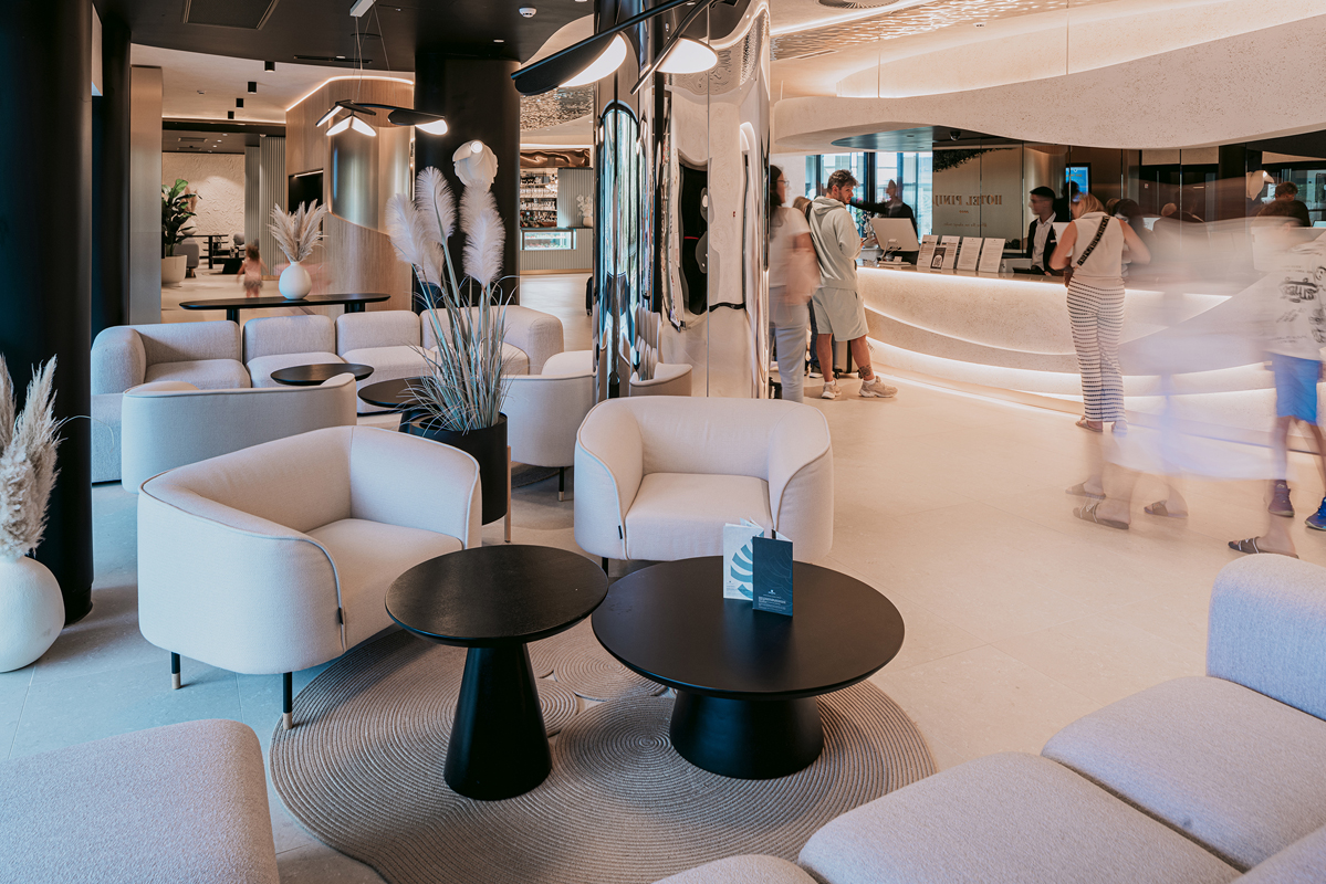 hotel nachádzajúci sa na malom polostrovčeku obklopený borovicami