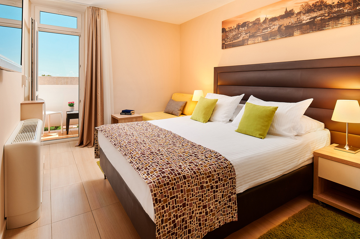 Premium 2+1 balkon mořská strana - 22 m² izba s manželskou posteľou alebo dvoma oddelenými lôžkami s možnosťou prístelky formou rozkladacieho gauča pre dieťa do nedovŕšených 16 rokov, sociálne zariadenie so sprchou, balkón s výhľadom na more