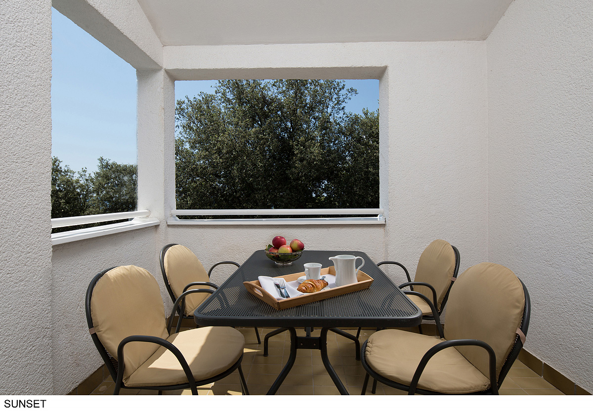 70 m² - mazonet - 2 spálne s manželskou posteľou či 2 samostatnými lôžkami, obývacia izba s rozkladacím gaučom pre 2 osoby, samostatná kuchyňa, 2x sociálne zariadenie so sprchou, 3x balkón (1. podlažie je obývacia izba, kuchyňa, kúpeľňa a priestranný balkón, na 2. podlaží sú spálne, kúpeľňa a 2x balkón); trilo 6 Sunset - rovnaká dispozícia ako typ A, je však komfortnejšie zariadený a umiestnený bližšie k moru