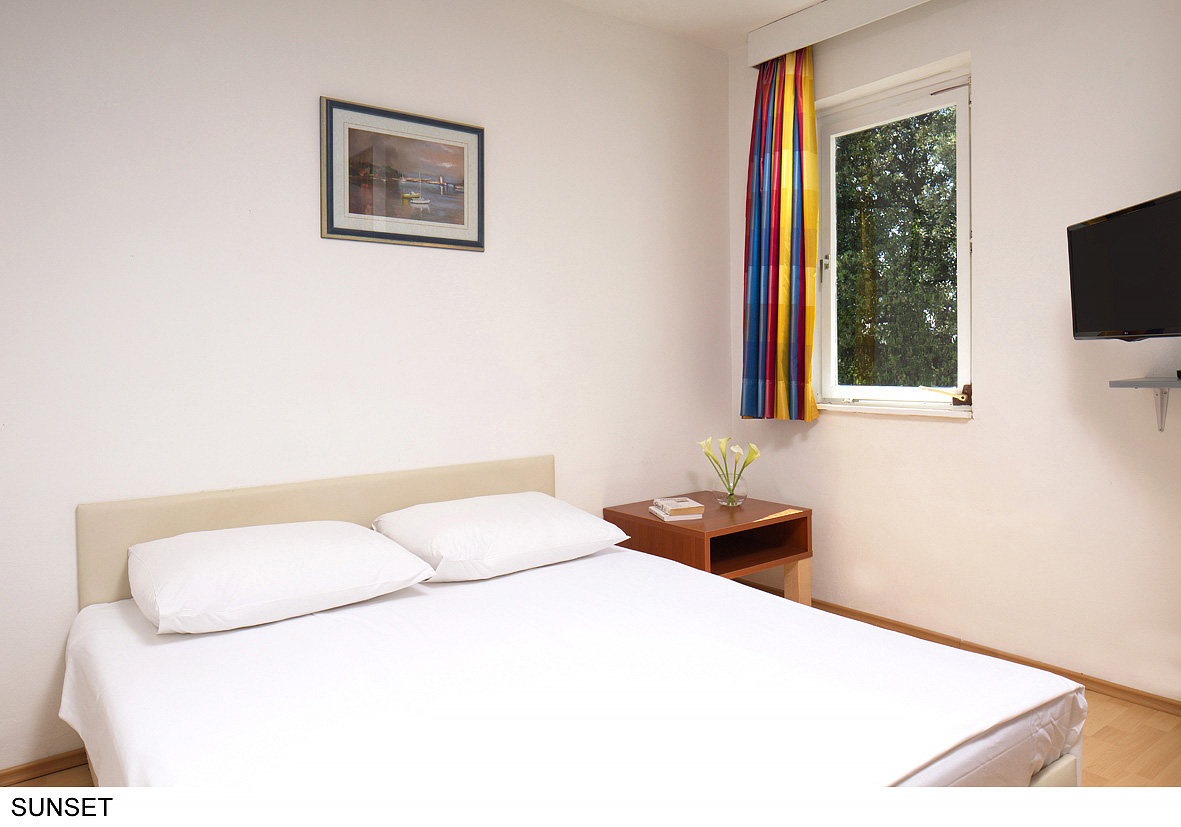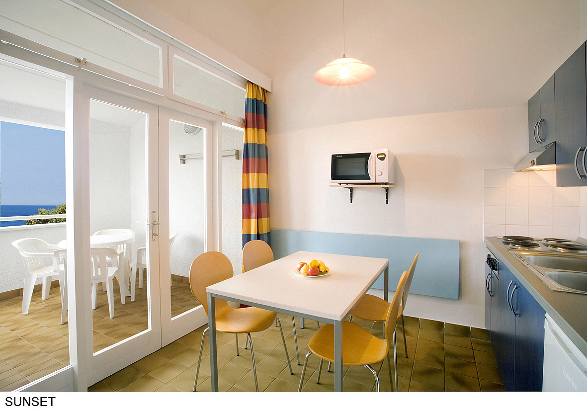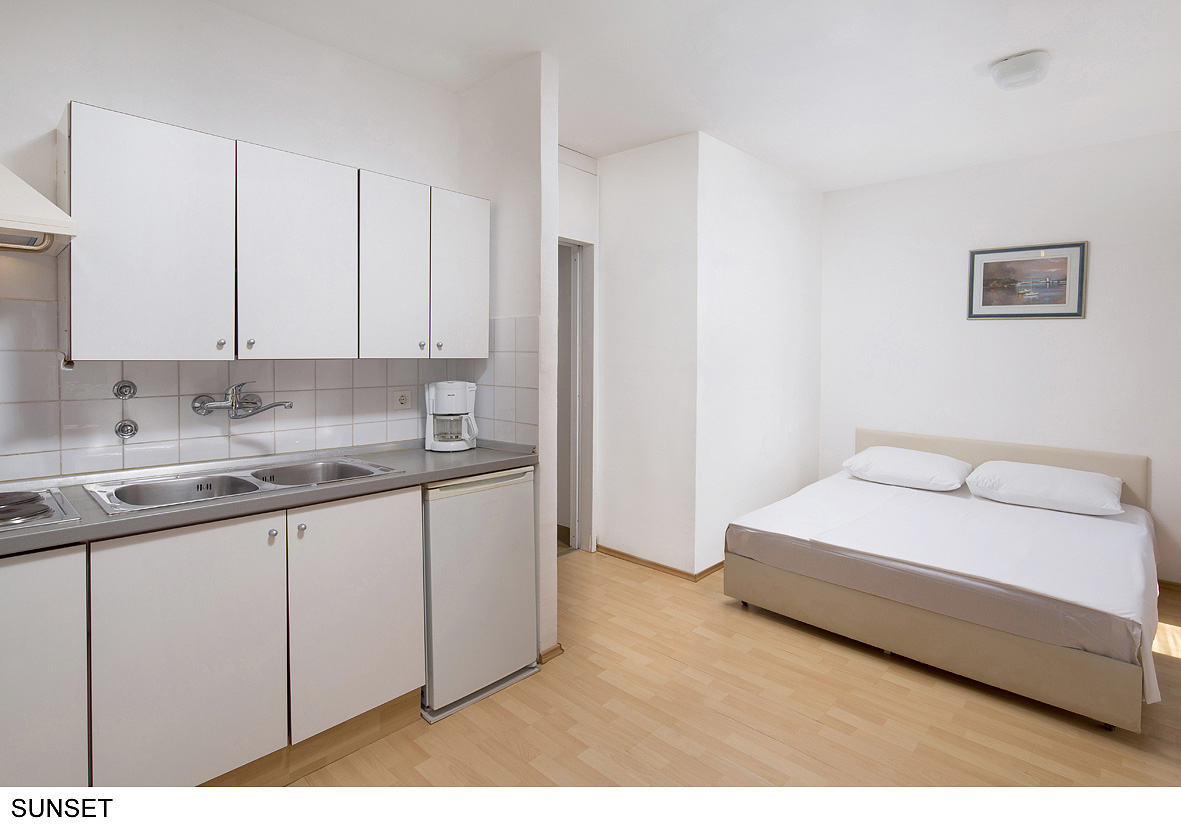 37 m² - 1 spálňa s manželskou posteľou či 2 samostatnými lôžkami, obývacia izba s rozkladacím gaučom pre 1 osobu, kuchynský kút vo vstupnej časti apartmánu, sociálne zariadenie so sprchou, balkón (spravidla orientovaný na more); bilo 3 Sunset - rovnaká dispozícia ako typ A, je však komfortnejšie zariadený a umiestnený bližšie k moru