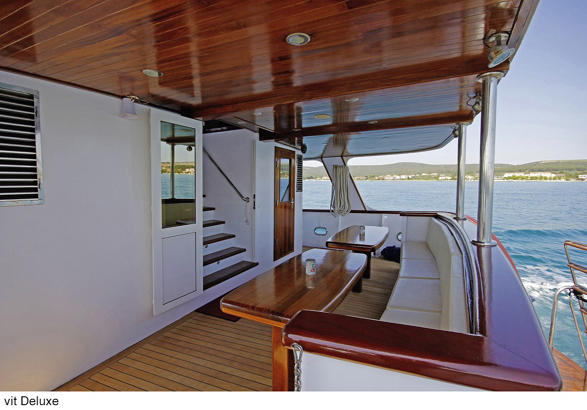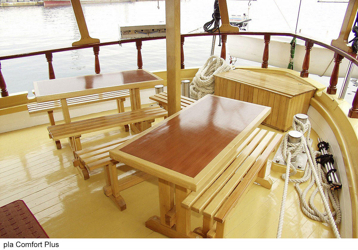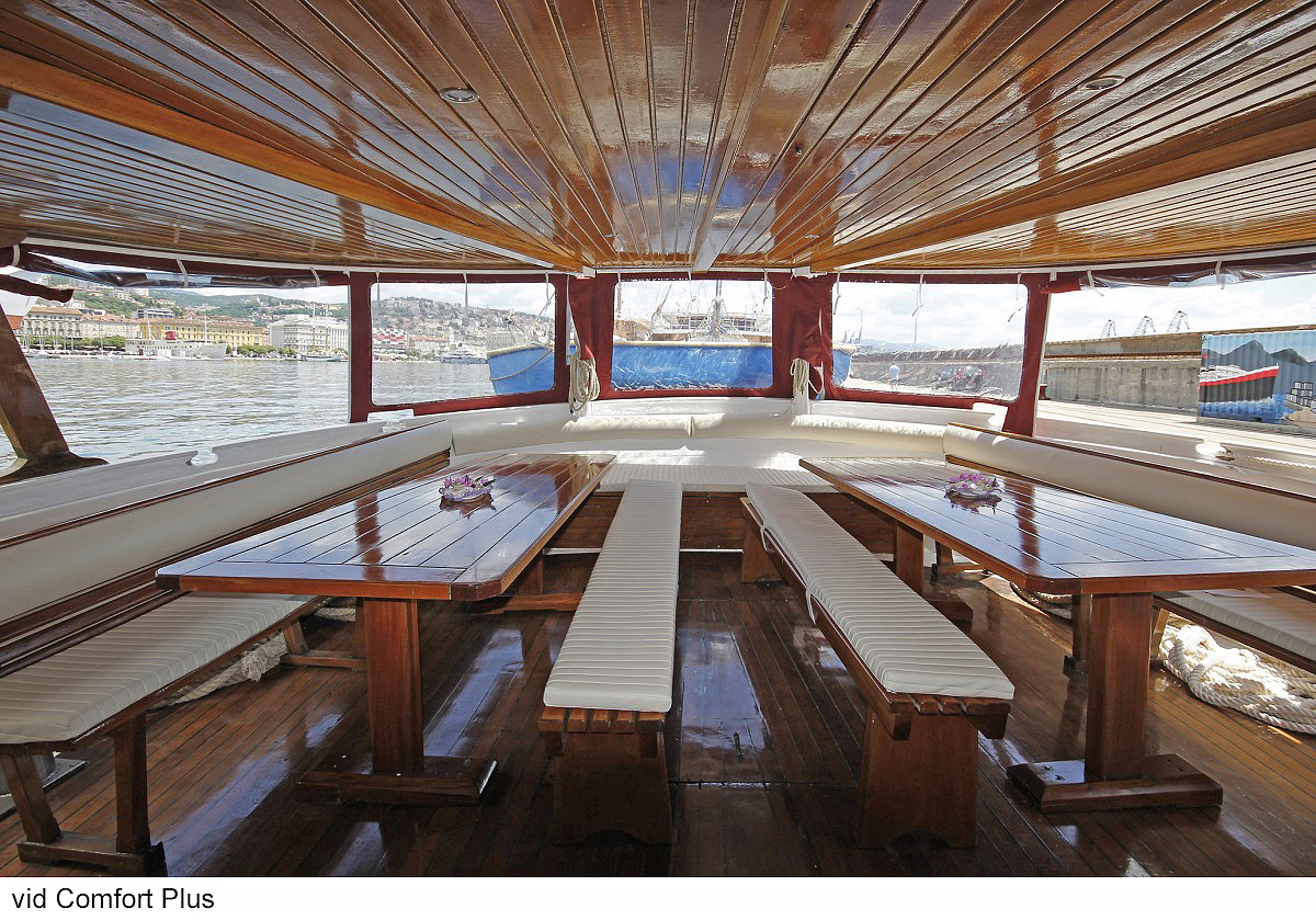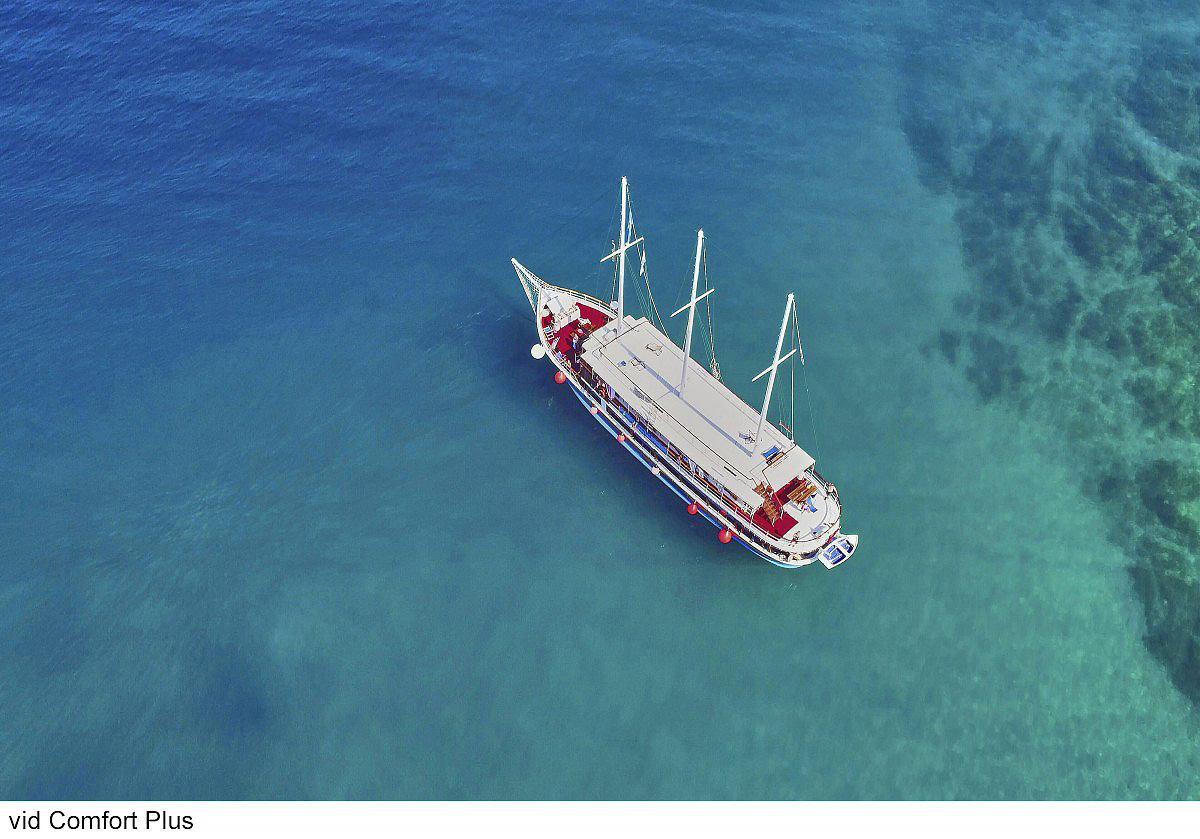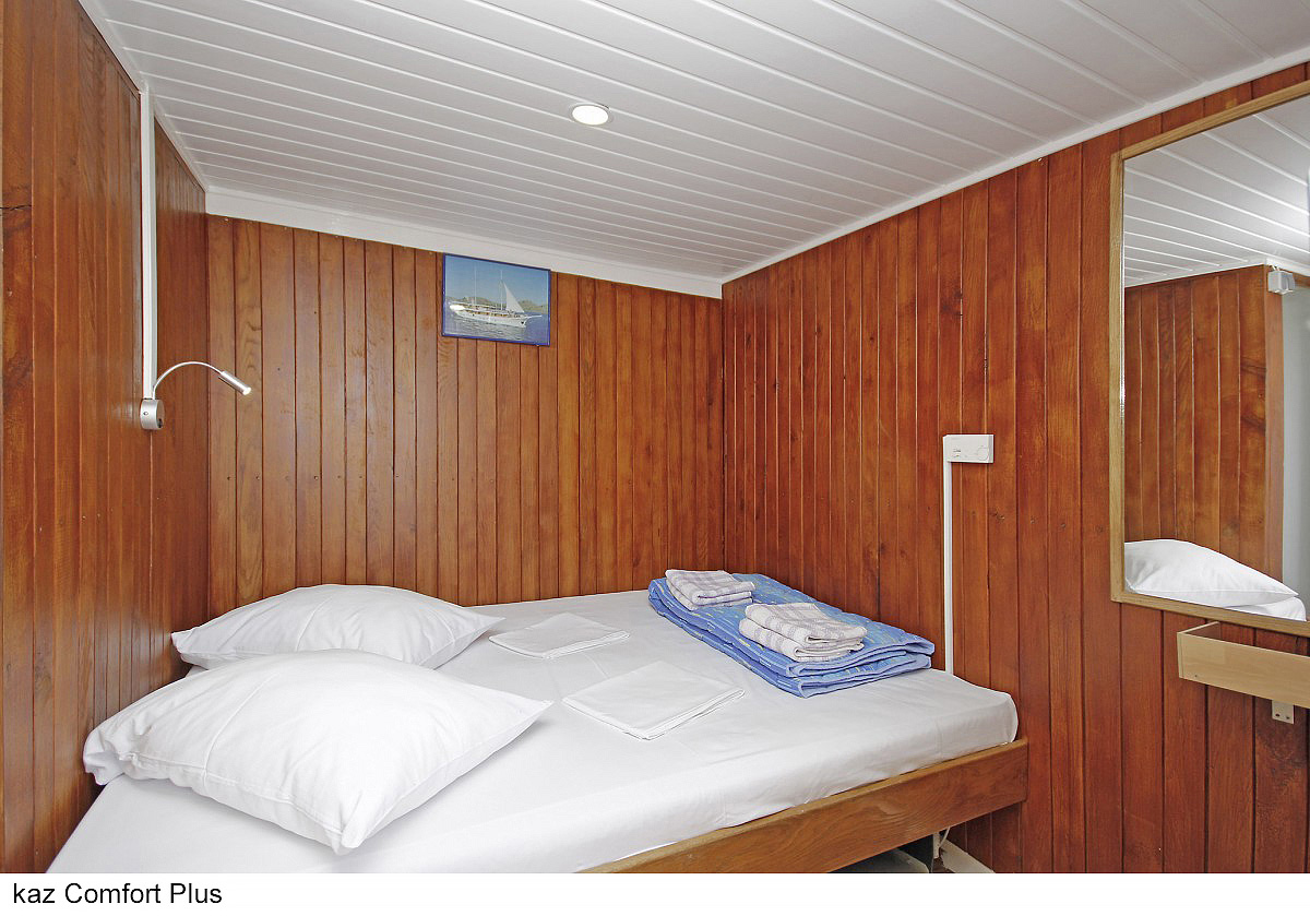 lode kategórie Comfort plus / motorové plachetnice s dreveným alebo oceľovým trupom, lode kategórie Deluxe / luxusné motorové jachty s oceľovým trupom, krytý salónik na hornej palube a kúpacia plošina vzadu. Za príplatok je možné rezervovať kajutu na palube, len vopred a na vyžiadanie. U kategórie Comfort plus voda zo sprchy odteká do podlahovej vpusti, nejedná sa o sprchový kút a nie je oddelená závesom.