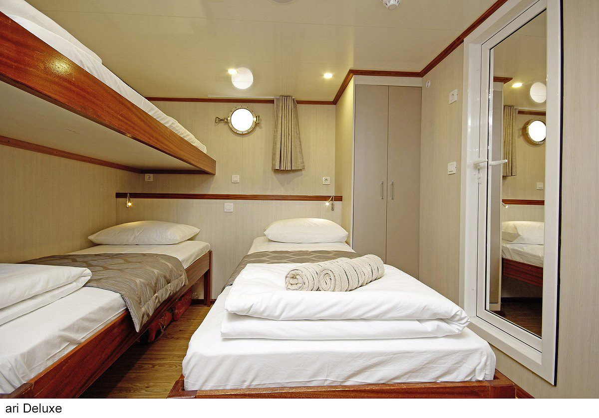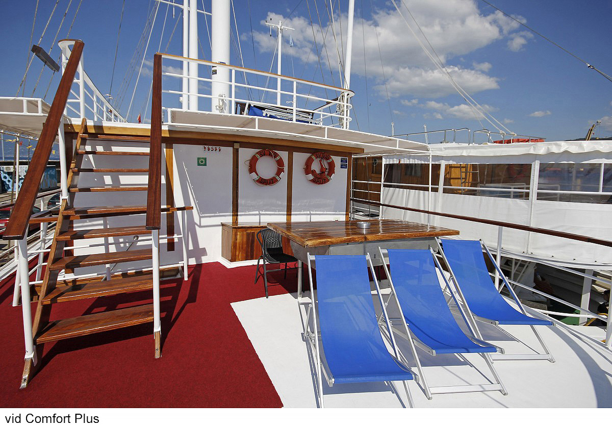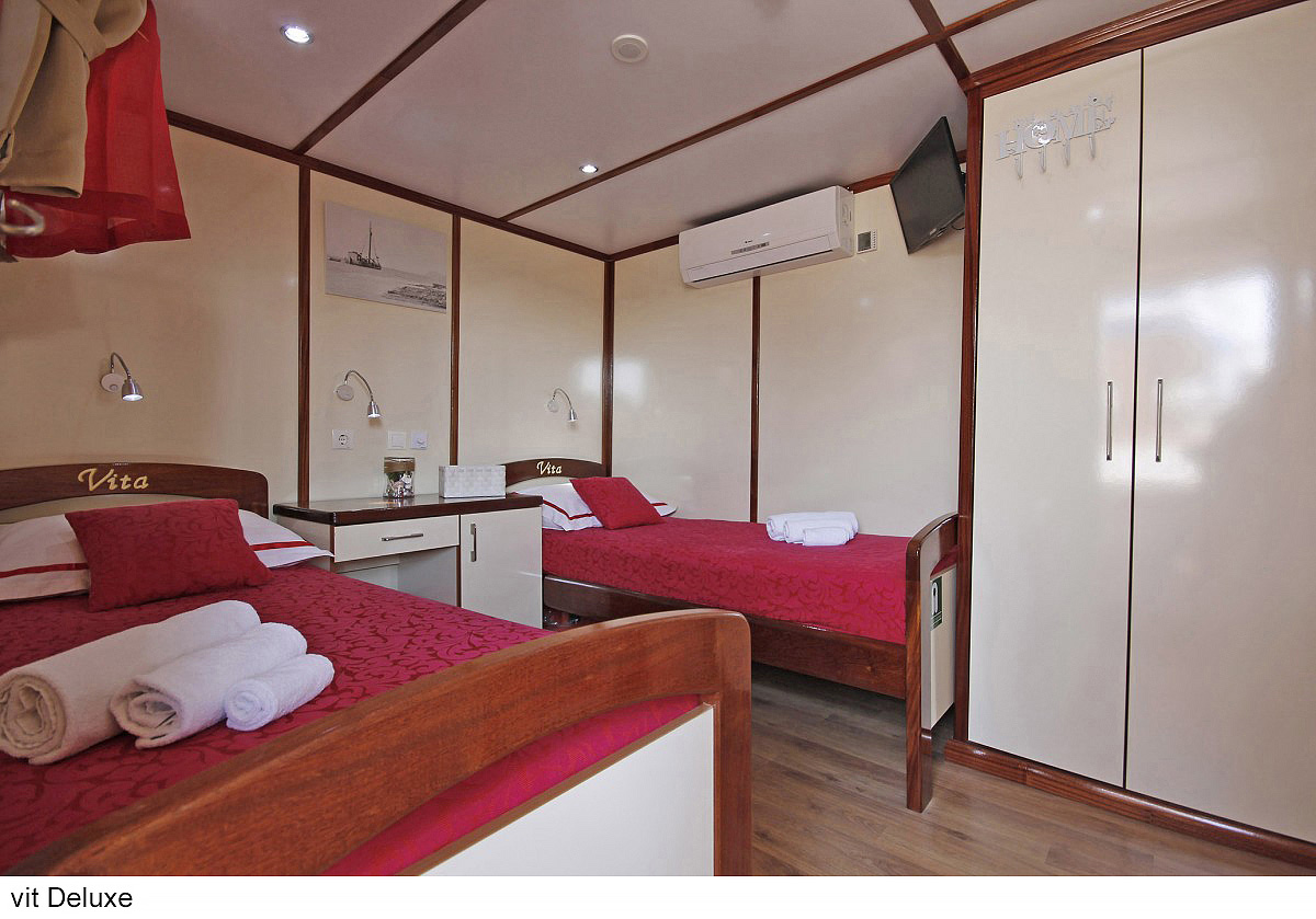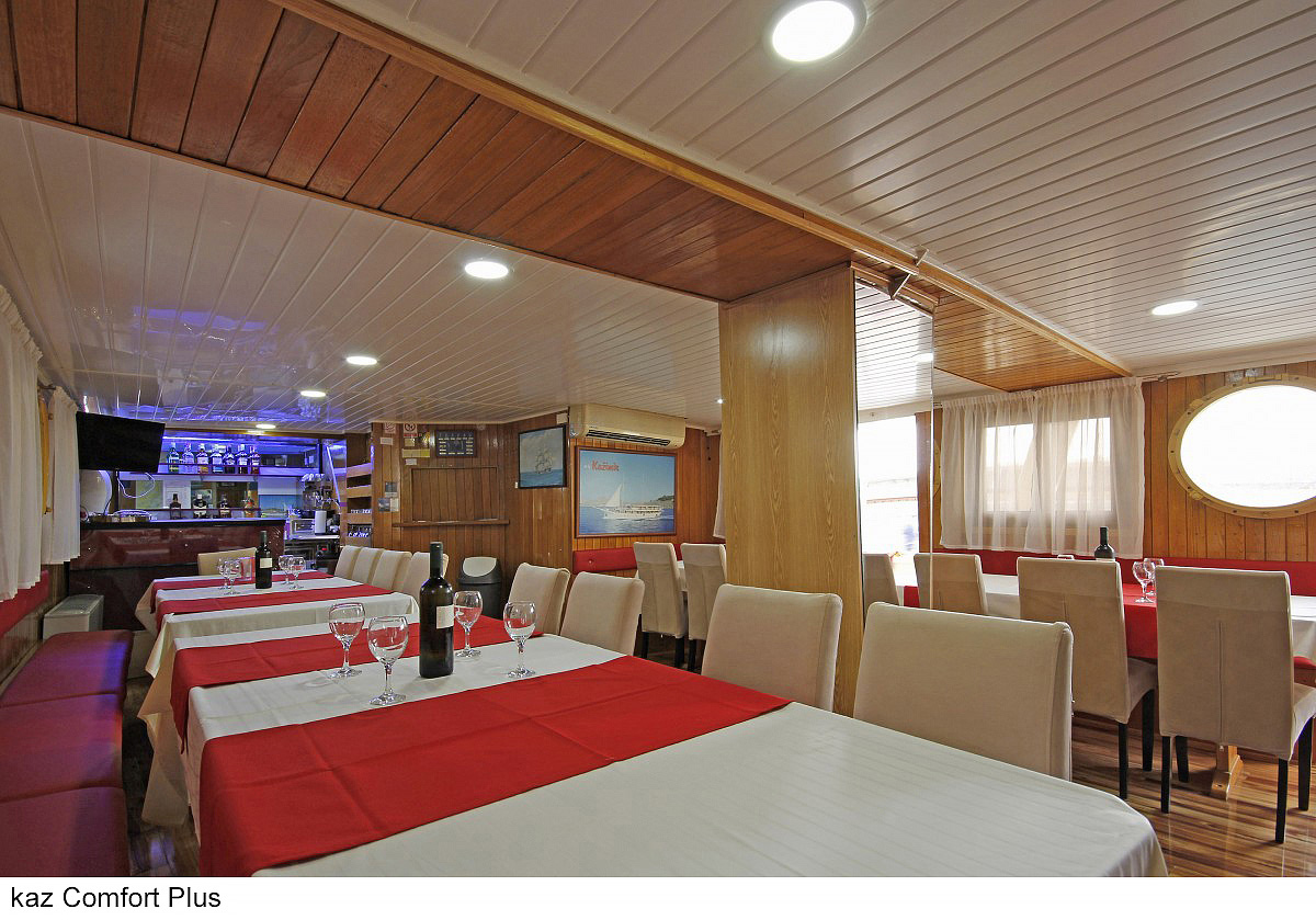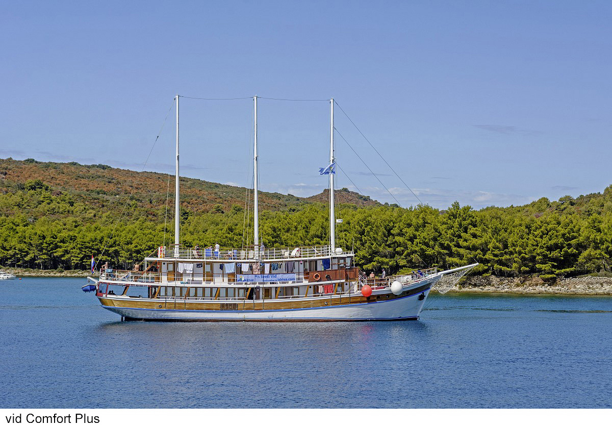 lode kategórie Comfort plus / motorové plachetnice s dreveným alebo oceľovým trupom, lode kategórie Deluxe / luxusné motorové jachty s oceľovým trupom, krytý salónik na hornej palube a kúpacia plošina vzadu. Za príplatok je možné rezervovať kajutu na palube, len vopred a na vyžiadanie. U kategórie Comfort plus voda zo sprchy odteká do podlahovej vpusti, nejedná sa o sprchový kút a nie je oddelená závesom.