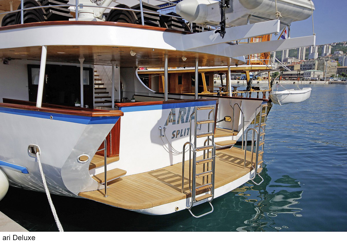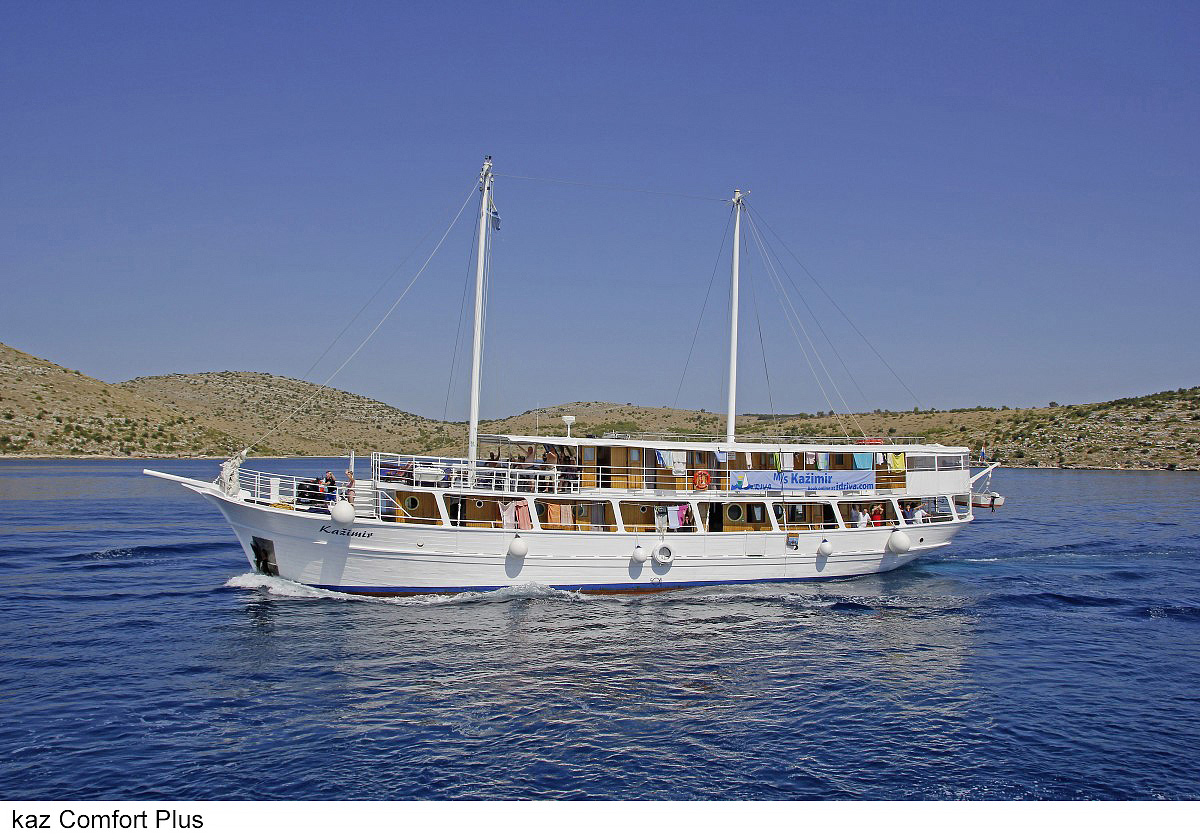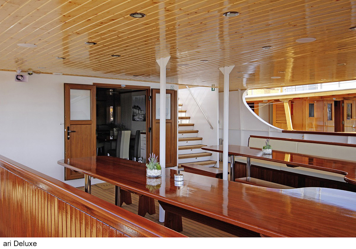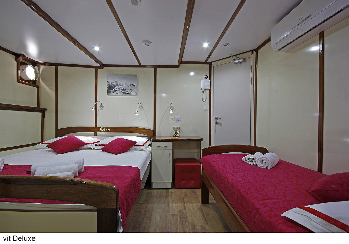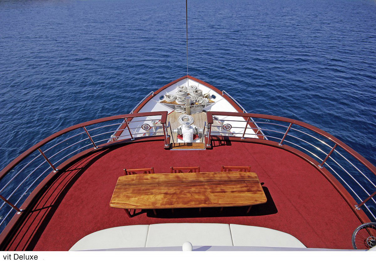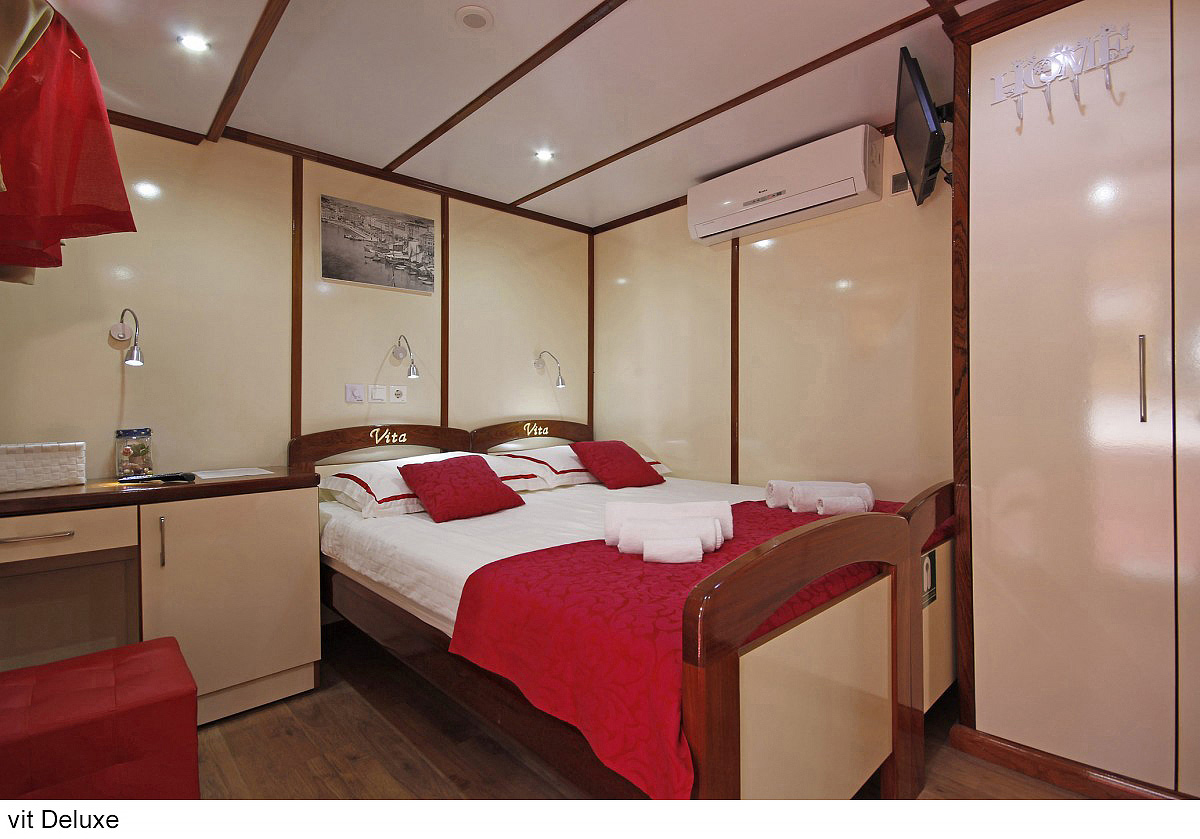 lode kategórie Comfort plus / motorové plachetnice s dreveným alebo oceľovým trupom, lode kategórie Deluxe / luxusné motorové jachty s oceľovým trupom, krytý salónik na hornej palube a kúpacia plošina vzadu. Za príplatok je možné rezervovať kajutu na palube, len vopred a na vyžiadanie. U kategórie Comfort plus voda zo sprchy odteká do podlahovej vpusti, nejedná sa o sprchový kút a nie je oddelená závesom.