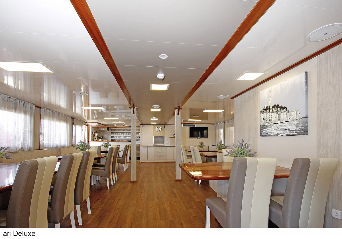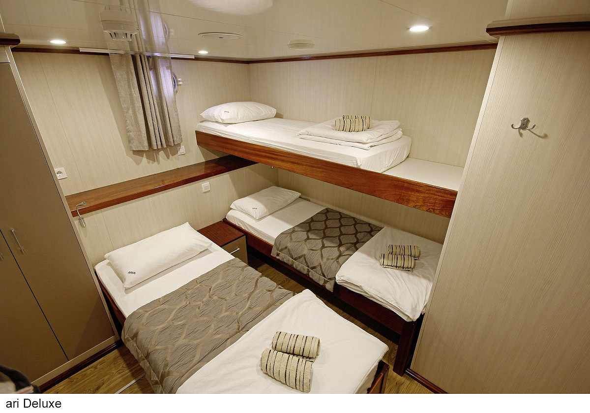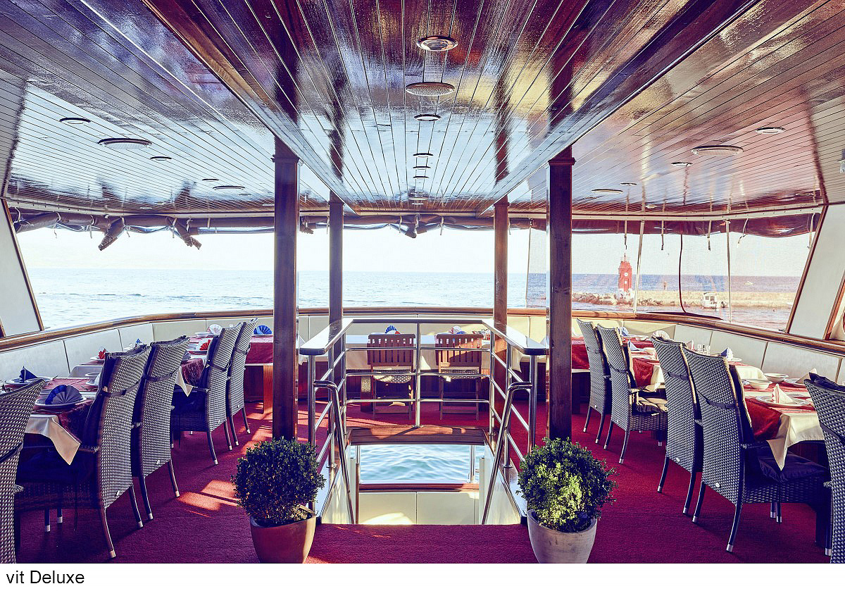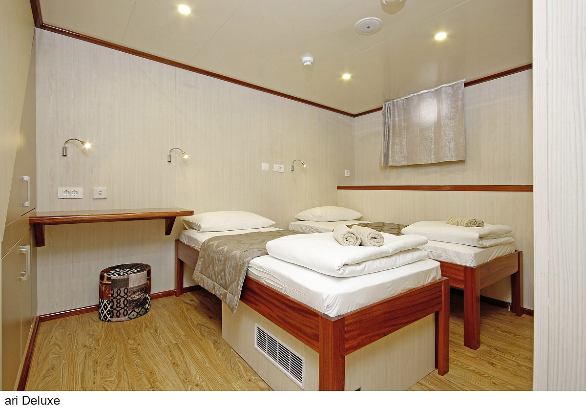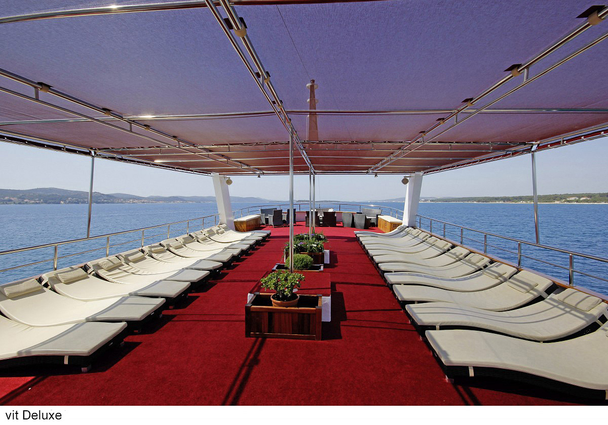 lode kategórie Comfort plus / motorové plachetnice s dreveným alebo oceľovým trupom, lode kategórie Deluxe / luxusné motorové jachty s oceľovým trupom, krytý salónik na hornej palube a kúpacia plošina vzadu. Za príplatok je možné rezervovať kajutu na palube, len vopred a na vyžiadanie. U kategórie Comfort plus voda zo sprchy odteká do podlahovej vpusti, nejedná sa o sprchový kút a nie je oddelená závesom.