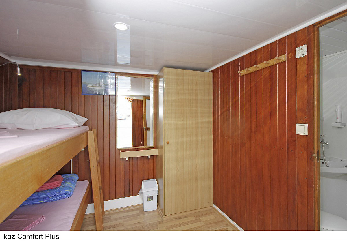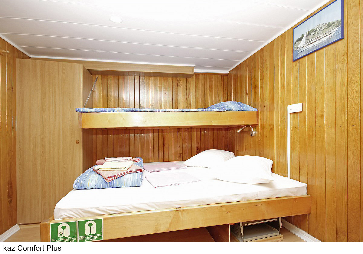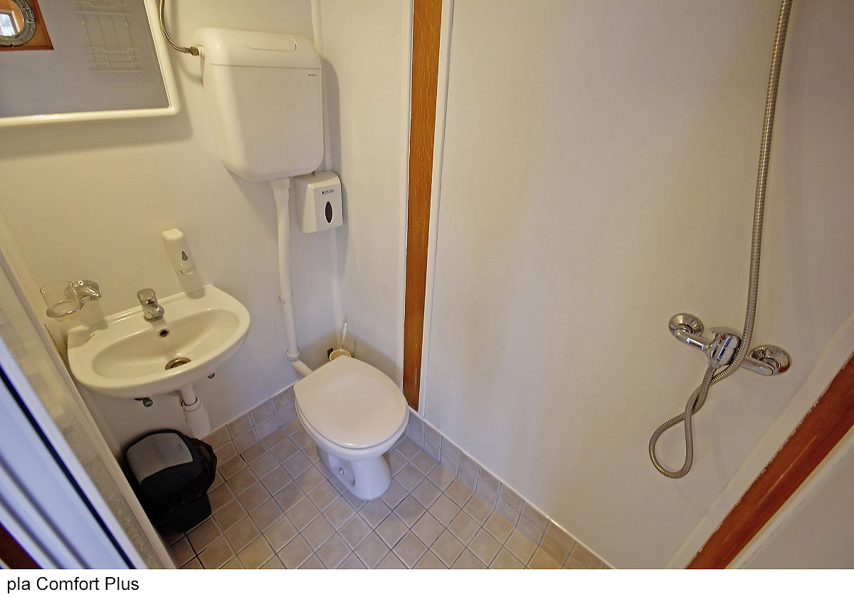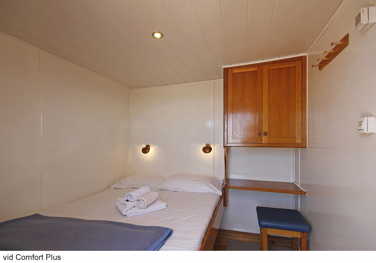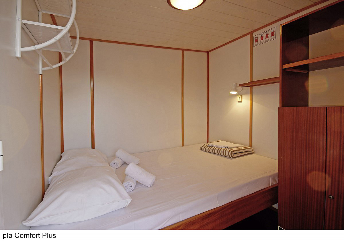 Comfort plus 2 - kajuta s poschodovou posteľou alebo francúzskym lôžkom, vlastné sociálne zariadenie so sprchou a WC, popis platí i pre Comfort plus 1